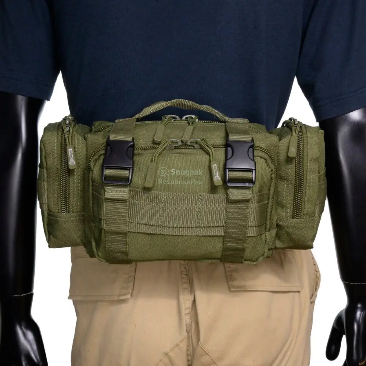 Snugpak Response Pak - это поясная сумка, что идеально подойдет в качестве органайзера, EDC сумки для города, Quick Grab Bag (сумка для экстренных ситуаций) или же тактической сумки военного. Response Pak выполнена из устойчивого к разрывам нейлона. Сетчатый карман в основном отсеке и система кармашков в меньшем (фронтальном отсеке) позволяют удобно разместить все ваши аксессуары. Сумочка оснащена и двумя небольшими боковыми кармашками (под мультитул или другие безделушки). Конструкция позволяет спрятать лямки и подвесить сумочку на систему MOLLE (рюкзак, РПС, жилет и тд). Сверху есть удобная ручка для переноски. Поясной ремень подойдет для талий до 115 см в обхвате.