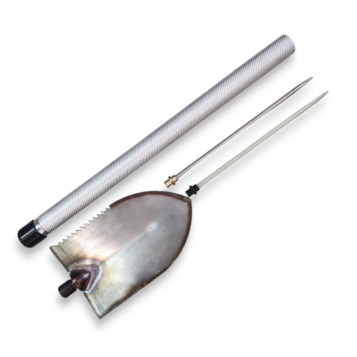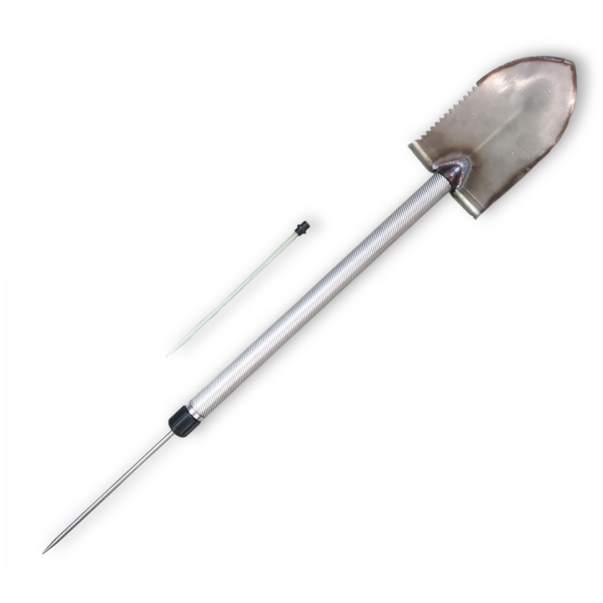 Жало щупа прячется внутрь. Лопатка присоединяется к ручке с помощью резьбового соединения.