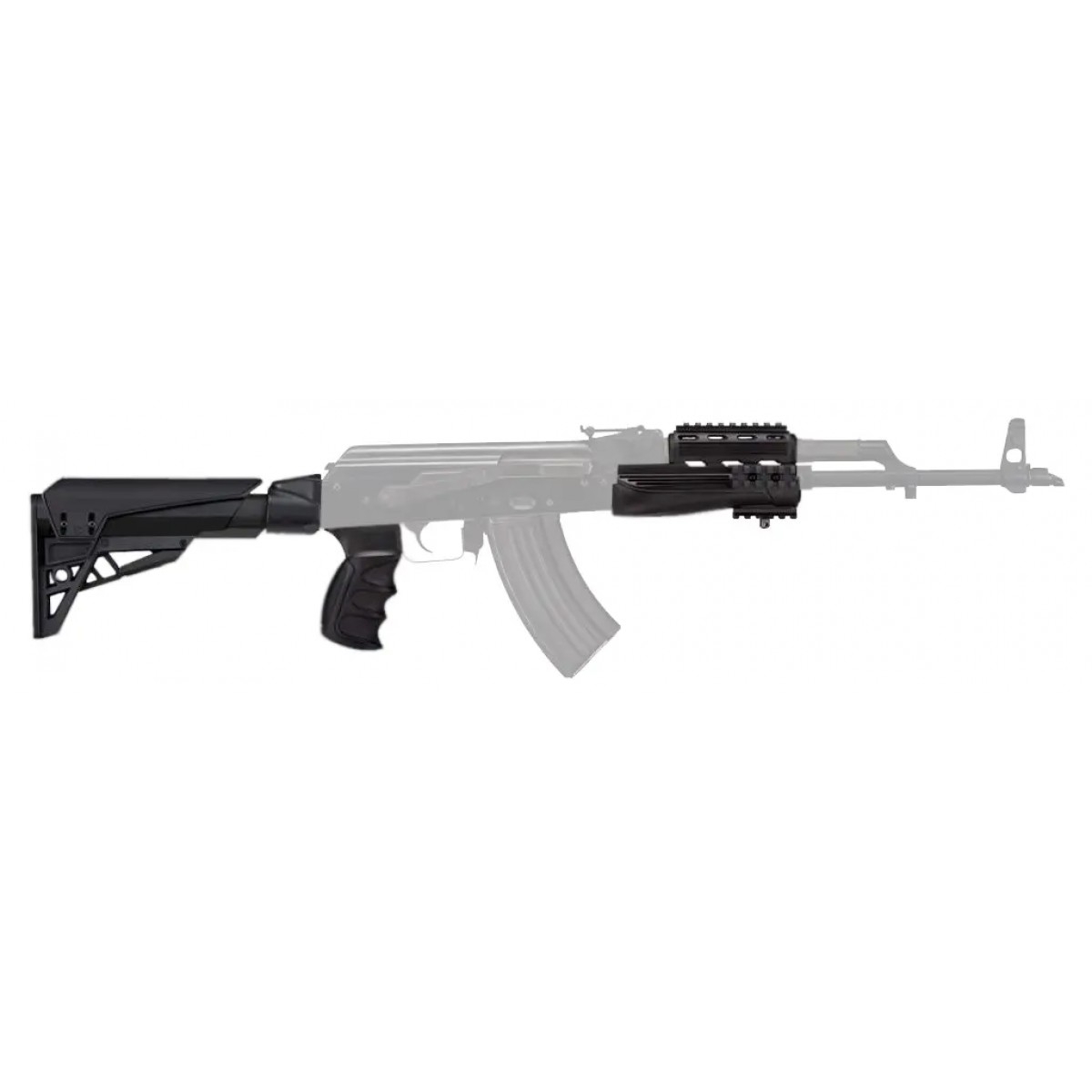 Тактический обвес для АК ATI Strikeforce Elite предназначен для замены штатного цевья, пистолетной рукоятки и фиксированного приклада АК со штампованной ствольной коробкой. 6-ти позиционная труба приклада изготовлена из алюминиевого сплава 6061 T6. Профиль трубы - commercial spec. Резиновый затыльник снижает уровень отдачи и делает стрельбу более комфортной. Эргономичная пистолетная рукоять делает удержание карабина более комфортным, также и при использовании перчаток. Цевье изготовлено из прочного полимера и оснащено планками Weaver/Picatinny для установки коллиматорного прицела, тактической рукоятки и фонаря.