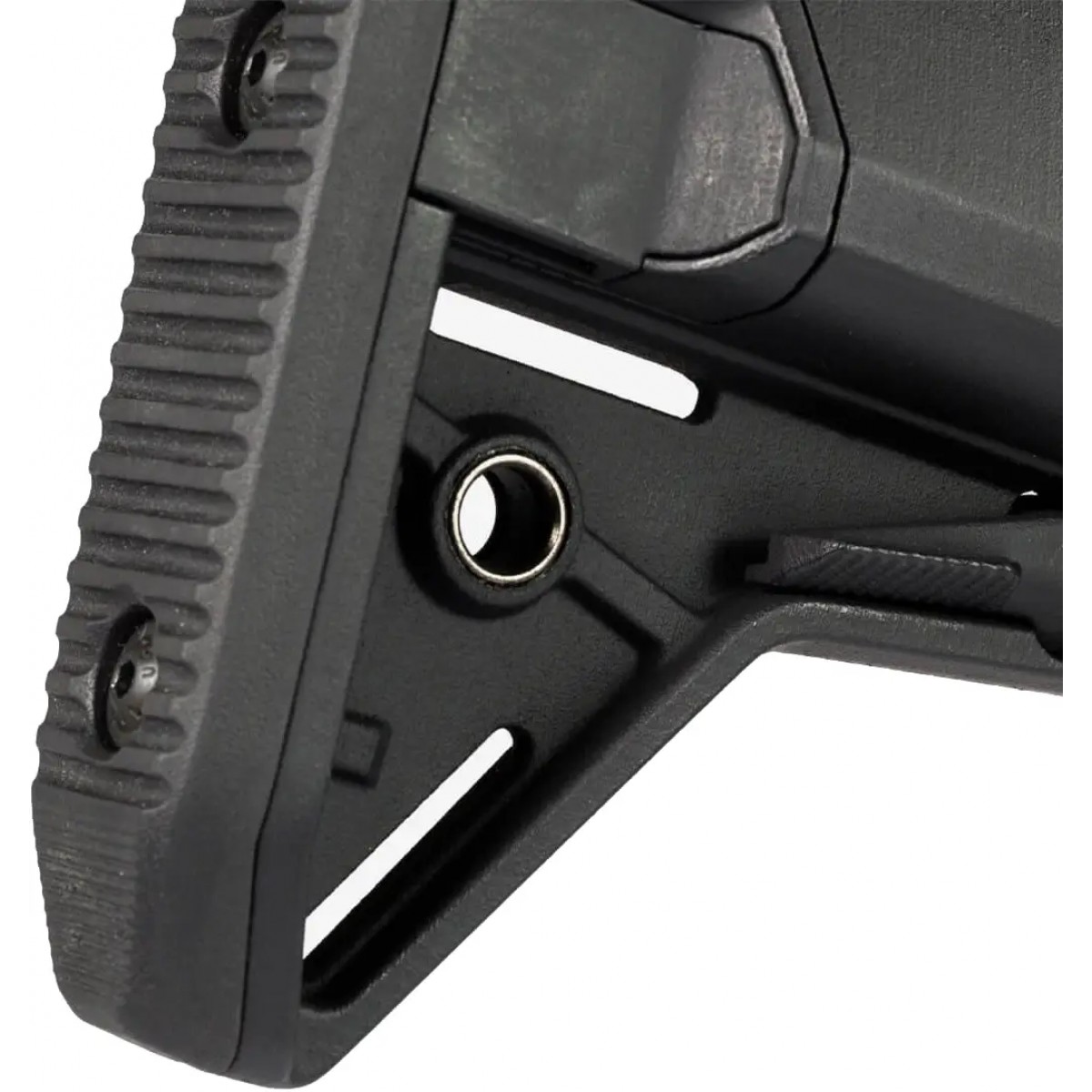 Профиль данного приклада обеспечивает удобную вкладку, а также является одним из самых легких и компактных прикладов, вмещающих в себя герметичные отсеки для хранения батареек формата CR123A или AA.