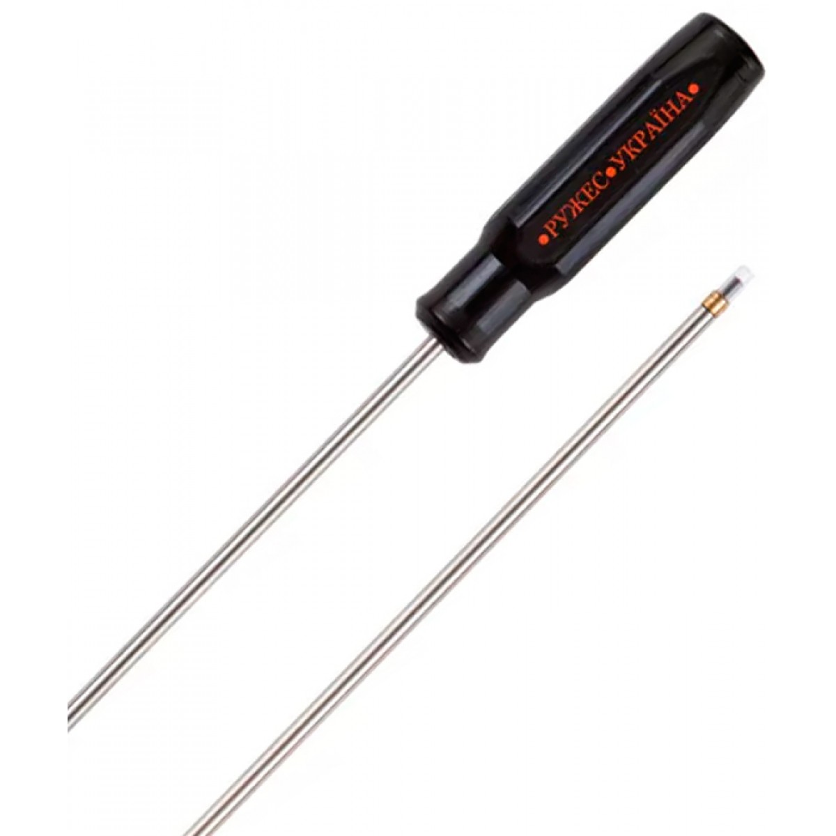 Шомпол для чистки пневматического нарезного оружия. Длина стальной рабочей части - 90 см, что позволяет работать с длинноствольными винтовками. Конструкция неразборная. Рукоять эргономичная, из полимера. На рабочей части установлен латунный вишер.