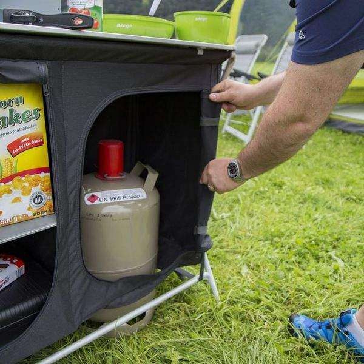 - Текстильный шкаф для хранения посуды, продуктов и газового баллона имеет два отделения с пластиковыми вставками на дне, закрывающиеся на молнию и вертикальное отделение для баллона, закрывающееся на молнию