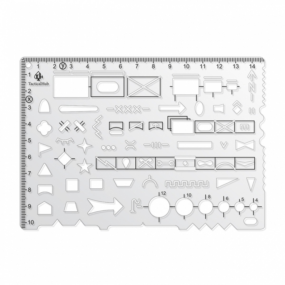 На линейке расположены все основные символьные обозначения, что позволяет быстро нанести на карту тактическую обстановку. Все обозначения нанесены с помощью уф печати и не сотрутся даже при длительном использовании.