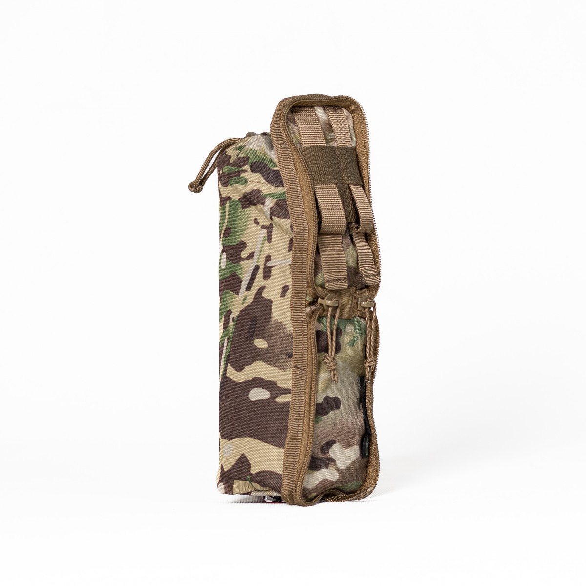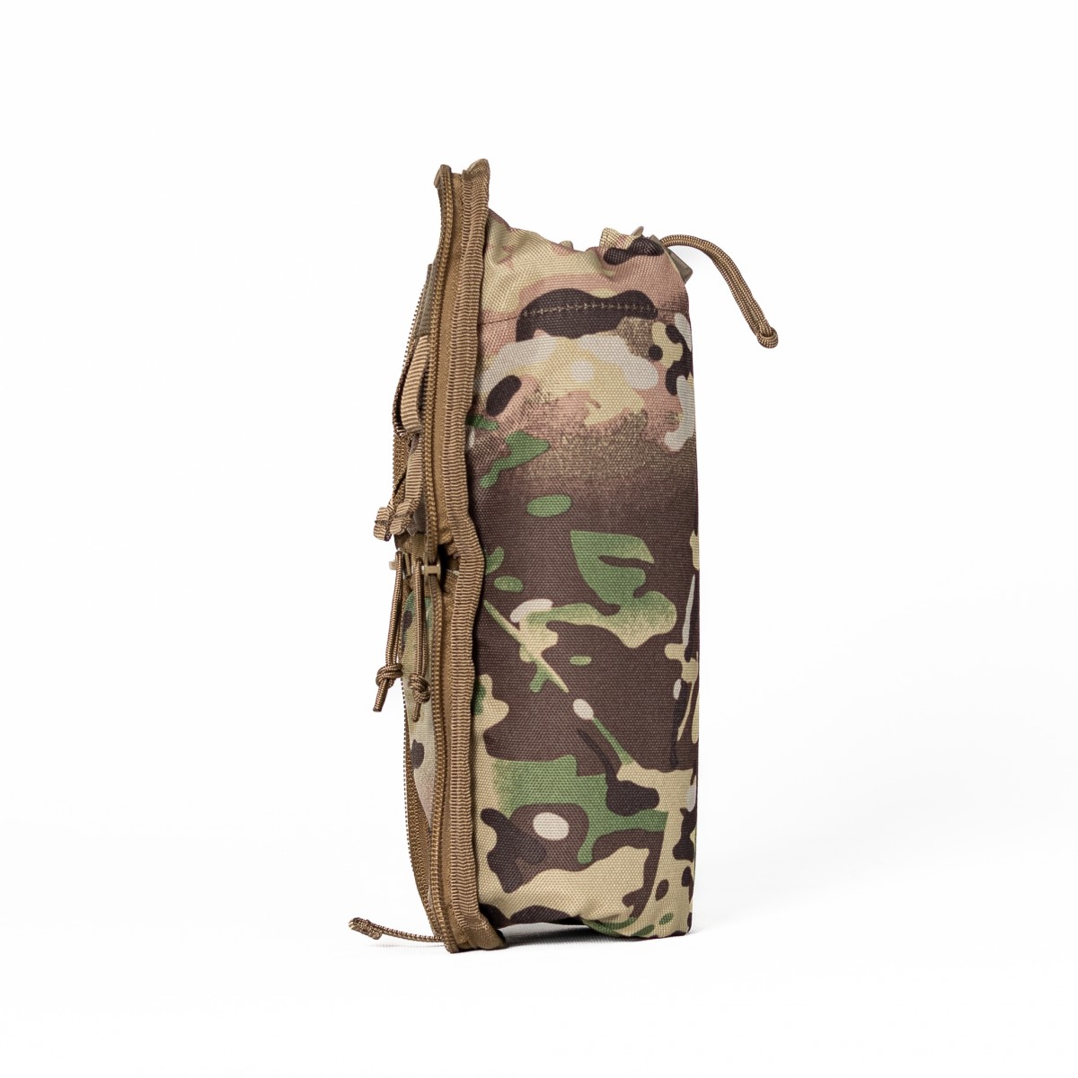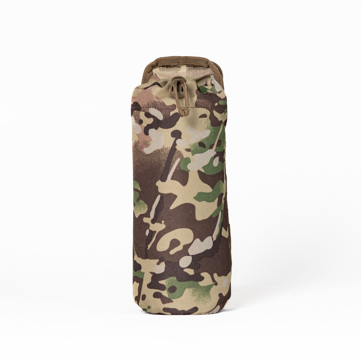 Данный подсумок был создан для удобной переноски цилиндрических компонентов снаряжения, таких как бутылка с водой, термос, оптические приборы и прочий тактический инвентарь. При необходимости ППР1 можно использовать как сумку сброса магазинов, но стоит учитывать его более компактные размеры по сравнению со специализированными изделиями. Особенности изделия Подсумок под бутылку наделен рядом полезных характеристик: Заворачивается сам в себя и застегивается на молнию с двух сторон. Язычок между бегунками позволяет мгновенно распахнуть подсумок и сразу использовать по назначению. Горловина развернутого подсумка стягивается паракордовым шнурком с фиксатором. В него без проблем помещается бутылка 1,5 л или термос аналогичного размера. Также можно переносить 60-миллиметровые минометные мины просто в транспортировочных тубусах. Изделие размещается на два ряда системы MOLLE, при этом по ширине занимает всего две секции и не мешает другому снаряжению. Подсумок очень удобно крепится на «Колчан», РПС или может использоваться как дополнительный карман на рюкзаке с системой MOLLE. Технические характеристики Внешний материал: Cordura 500D. Внутренний материал: Oxford 600D. Стропа: полиамид, 2; 2,5 см. Размер в сложенном состоянии: 14×9×3 см. Размер в разложенном состоянии: 25×9×10 см. Диаметр: 9 см. Вес: 80 г.Основные характеристики Подсумок под бутылку раскладной ППР1 (Мультикам)