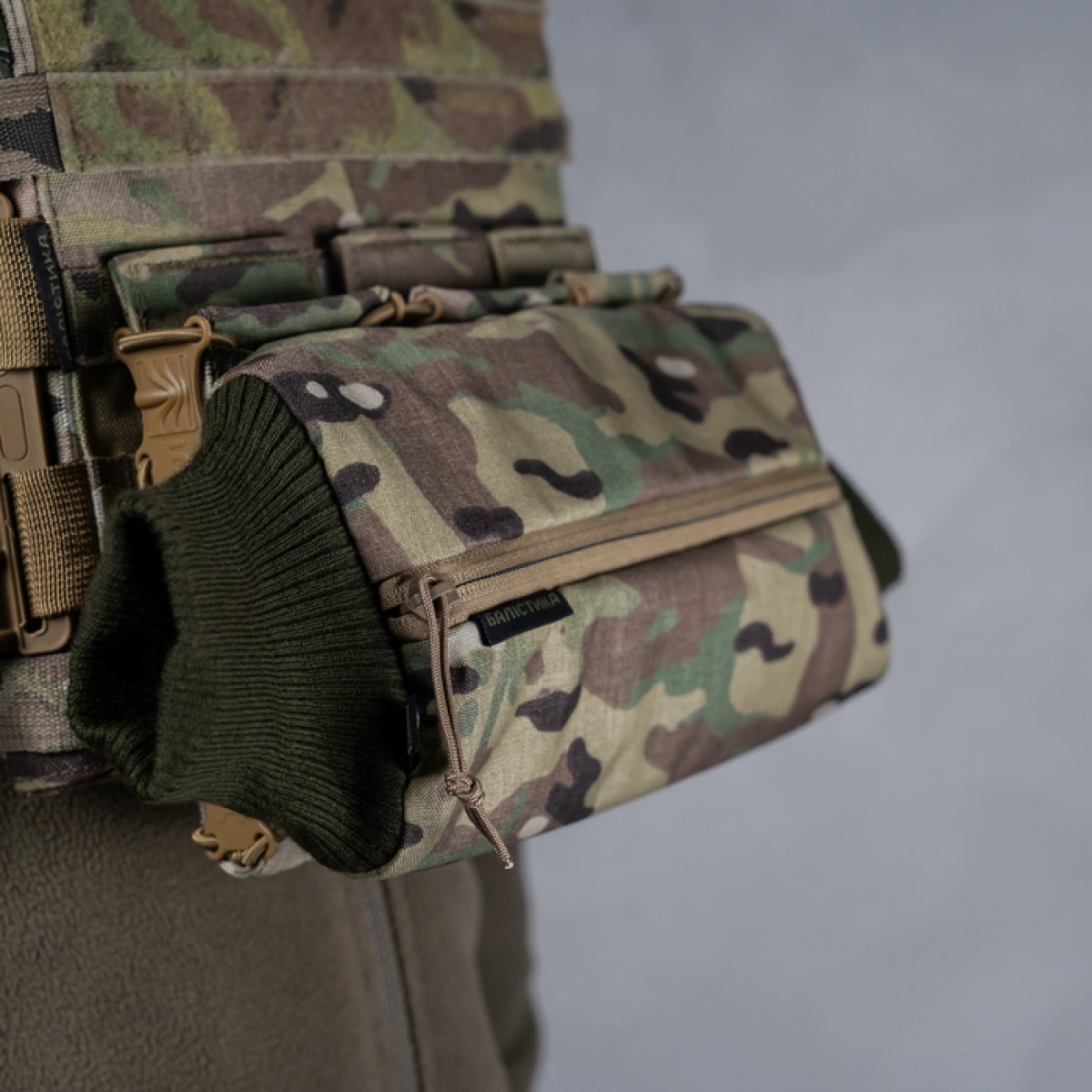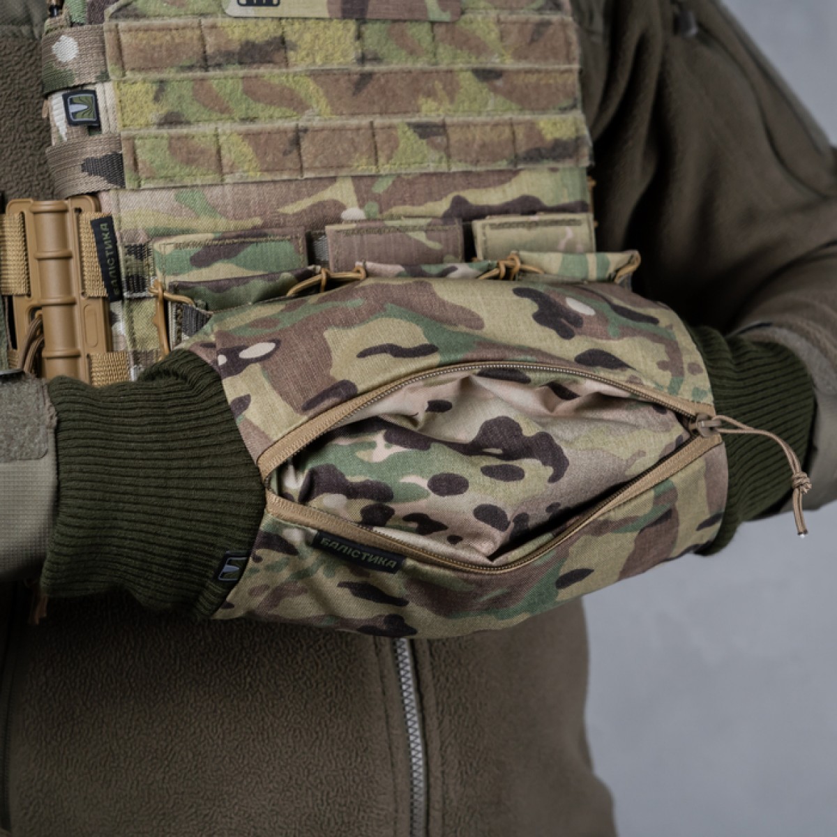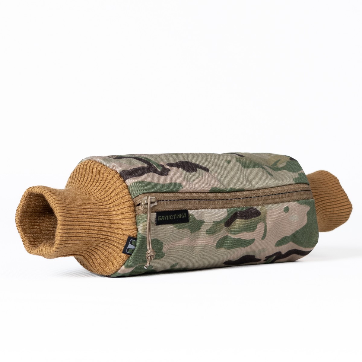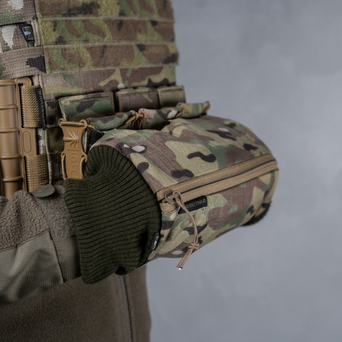 Холод не должен быть препятствием для выполнения задач. Сохранение мелкой моторики крайне важно для точности движений при работе с электронными устройствами и тактическими инструментами. Тактическая муфта от «Баллистика» согреет ваши руки, когда вы неактивны, и не станет помехой, когда вы будете двигаться. Особенности товара Благодаря продуманной конструкции муфта защитит руки от холода и сохранит их подвижность: Внешний слой изготовлен из ветро- и водонепроницаемой кордуры, внутренний – из плотного флиса, благодаря чему изделие способно хорошо сохранять тепло в мороз до -10-15 °C. Эффективность муфты увеличивается при использовании с термохимической грелкой. Крепится на плитоноску непосредственно или поверх подсумков для магазинов с помощью системы MOLLE. Другой вариант – носить с ремешком на плече или шее. При необходимости внутреннее пространство можно увеличить, для этого нужно расстегнуть кармашек на передней части. Если объема муфты достаточно, в кармане можно хранить телефон или другие небольшие вещи. Идеально подходит для службы на блокпосту, опорном и наблюдательном пункте, где важно быстро освобождать руки для ведения записей, работы с сенсорными экранами или во время стрельбы из штатного оружия. Также пригодится пилотам дронов. Технические характеристики Внешний материал: Cordura 500D или 1000D. Внутренний материал: флис плотностью 250-270 г/м2. Манжеты: трикотажное полотно. Вес: 150 г. Размеры: Ширина без манжет: 24 см. Ширина с манжетами: 38 см. Высота: 16 см. Диаметр в закрытом состоянии: 10 см. Диаметр в раскрытом состоянии: 15 см.Основные характеристики Тактическая муфта для рук (Мультикам)