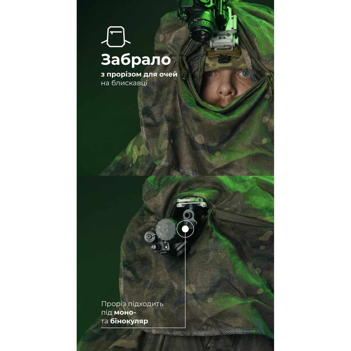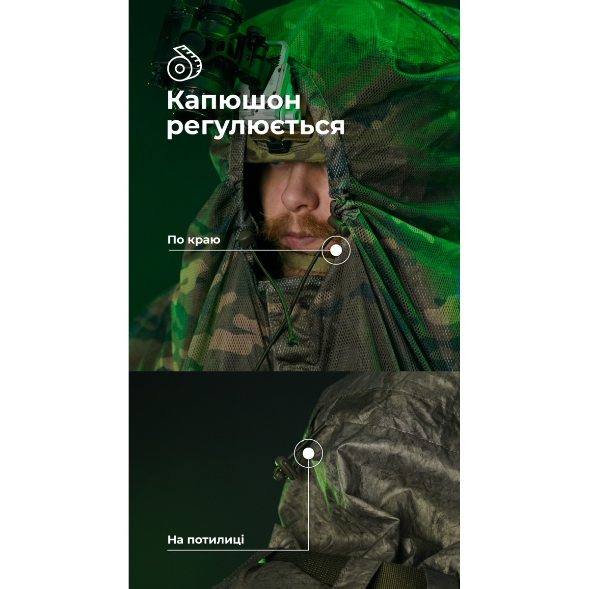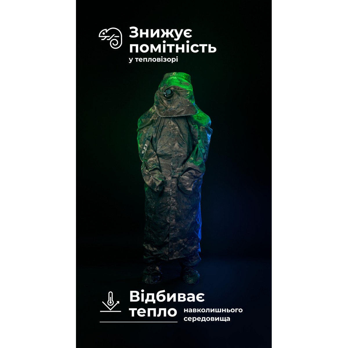 Пончо «Чугайстер» создано для маскировки военнослужащего от тепловизионных приборов, прицелов и дронов с тепловизионными камерами. Благодаря инновационной двусторонней ткани снижает заметность тепловой сигнатуры человека и адаптирует ее к температурному фону окружающей среды. ✅ Ключевые преимущества Маскирует от тепловизора и помогает бойцу дойти до позиций Уменьшает риск обнаружения, но не делает вас невидимым Отражает тепло окружающей среды Сетчатая сторона обеспечивает визуальную маскировку Перекидное забрало с прорезью для глаз на молнии Окошко для глаз совместимо с моно- и бинокуляром Регулируемый в двух проекциях капюшон В комплекте съемные нарукавники и бахилы Имеет свободный крой, небольшой вес, не сковывает движений Можно регулировать длину Тихие застежки на магнитах и кнопках Двусторонний чехол: камуфляж + сигнальный неоновый зеленый Описание товара «Чугайстер» не просто блокирует тепловое излучение, а отражает тепловую энергию окружающих объектов. Таким образом, тело военного теряет тепловой контраст с фоном, становится менее видимым для тепловизора. Благодаря этому эффект маскировки сохраняется даже при длительном ношении – в отличие от обычных средств (например, со слоем паробарьера), которые постепенно прогреваются и теряют эффективность. При этом «Чугайстер» лучше всего работает в пасмурную погоду, в сумерках и ночью. Можно использовать на две стороны: ✔️ 2D-сетка ✔️ Гладкая ткань Обе стороны обеспечивают экранирующие свойства и отражают тепловую сигнатуру от окружающих объектов. Сетчатая сторона дополняет их дополнительным визуальным маскированием для ясной погоды. В пасмурную погоду и ночью принципиальной разницы в выборе стороны пончо нет. Однако тесты показали, что вариант с сеткой наружу более универсален, он не создает аномально холодный контур и не отражает лунный свет. Модульная конструкция: ✔️ В комплекте идут два съемных нарукавника с клапанами, которые скрывают ладони по типу перчаток, и бахилы с клапанами для стоп. ✔️ На верхнем и нижнем краях они стягиваются шоккордом с фиксаторами. ✔️ В клапанах нарукавников есть отверстия, через которые можно быстро вынуть или спрятать ладони. ✔️ На клапане бахил есть дополнительный шоккорд – он нужен для того, чтобы клапан держался на стопе во время движения и не сползал. Функциональный капюшон: ✔️ По краю и на затылке в нем протянуты шоккорды с фиксаторами для регулировки объема. ✔️ Оснащен откидным забралом, которое скрывает лицо от обнаружения. На уровне глаз в него вшита молния (27 см) с двумя бегунками, которые позволяют изменять размер прорези. Это дает возможность адаптировать его под тепловизионные устройства (монокуляр или бинокуляр) без открытия лица. ✔️ В верхней части капюшона и в забрале встроены по два магнита. Поэтому при откидывании забрала назад оно остается на голове и не спадает на лицо. Застежка. Пончо оборудовано магнитными фиксаторами для быстрой и бесшумной застежки и расстежки. Для усиления фиксации также есть кнопки. Отверстия для рук. По бокам расположены отверстия (40 см), в которые можно просунуть руки. Они тоже застегиваются на магниты и кнопки. Поэтому их можно быстро открыть или закрыть без необходимости снимать пончо, чтобы выполнить работу. Свободный крой и легкий вес. Большой объем пончо позволяет