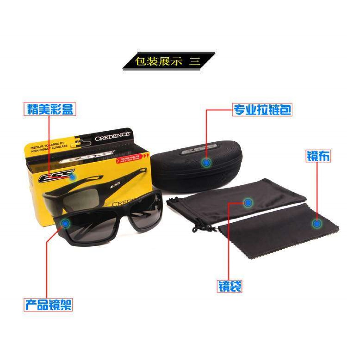 Очки Credence от ESS единственного эмитента тактических баллистических очков для Корпуса морской пехоты США и Министерства обороны США. Эти очки имеют затемненные несменные линзы из поликарбоната (UV400 защита) и сочетают в себе тактическое предназначение и повседневное удобство. Китайский вариант не обладает таким классом защиты, как оригинальный продукт, но все же способен уверенно держать различного рода щепки и бетонную крошку, а также небольшие предметы, летящие в глаза. Очки комплектуются жестким футляром и салфеткой для протирания.