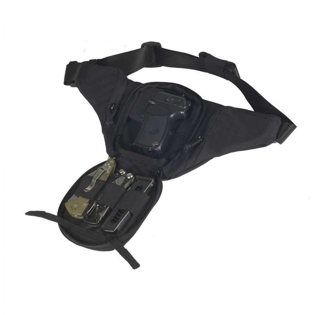 | Особенности: | -Оборудована одним карманом под пистолет, -двумя малыми карманами под мелочевку. -Карманы застегиваются на молнию. -Карман кобура оборудован лямками Hot-Pull™ для мгновенного открытия кобуры. -Пояс застегивается на фастекс. |