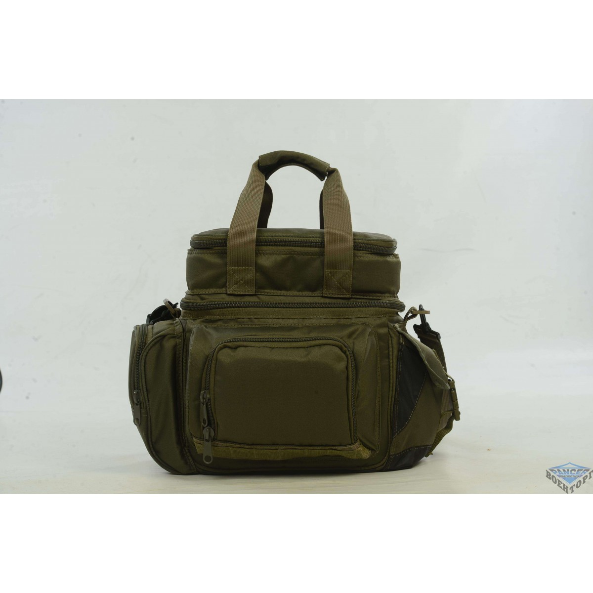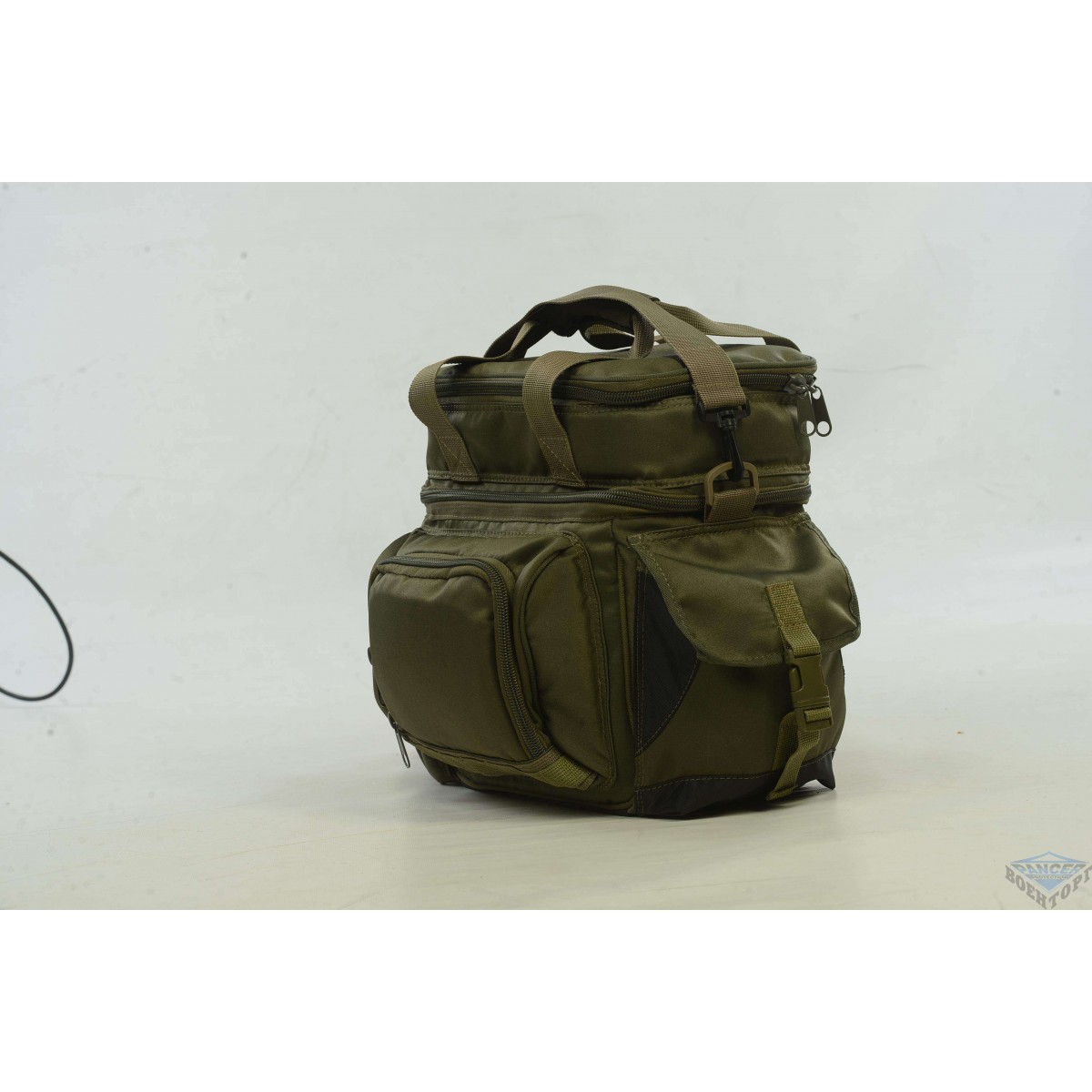 Сумка имеет объём 20л. Регулируемая лямка через плечо. Антискользящие ножки. Множество карманов для переноски снастей, катушек, насадок и прочих аксессуаров.