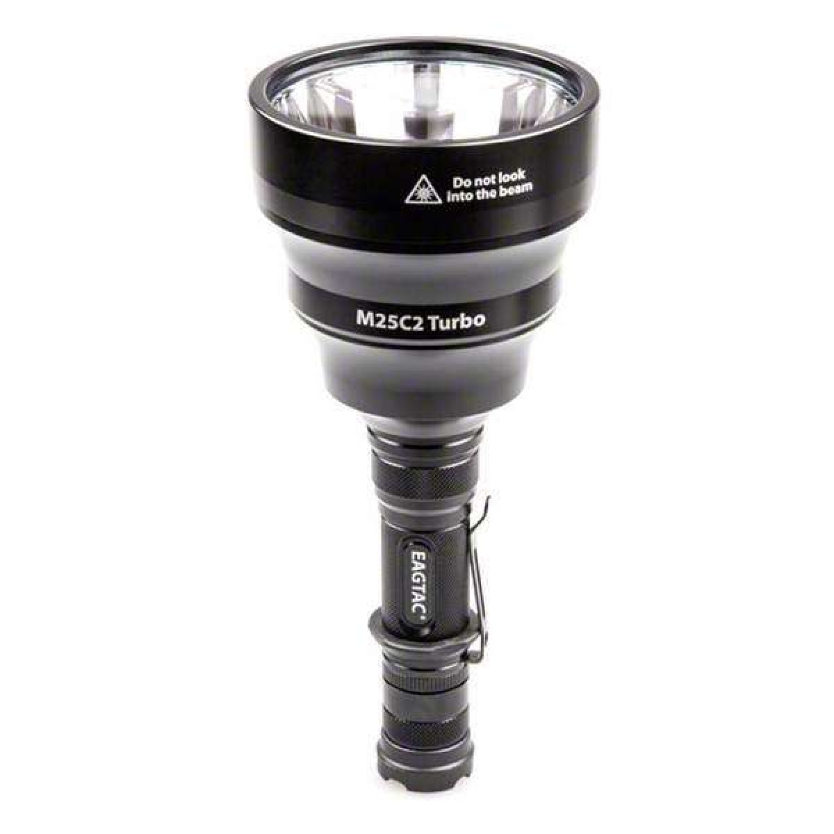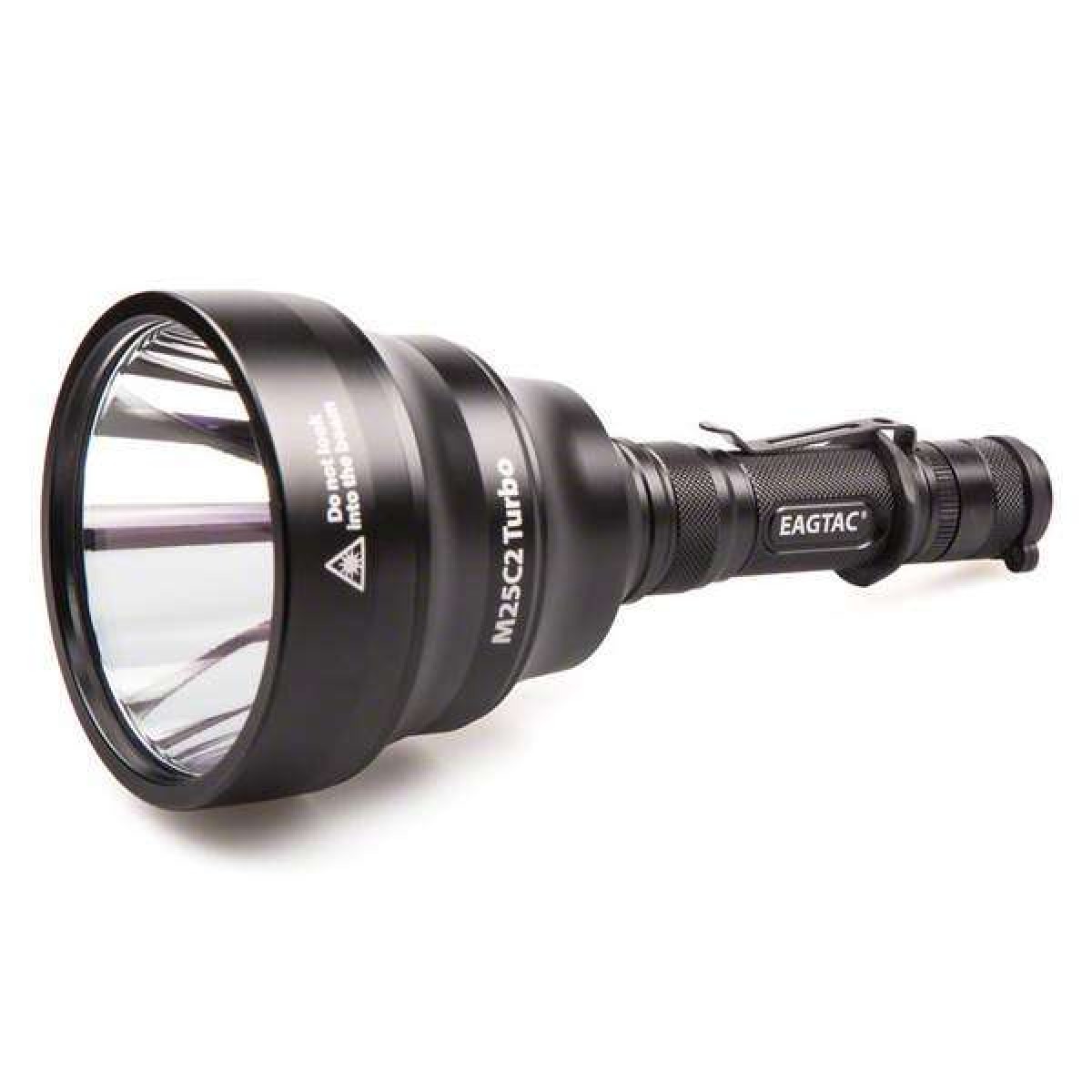 Турбо-голова EagleTac. Фонари Eagletac в версии Turbo оснащены турбо-головой с увеличенным гладким параболическим рефлектором, собирающим световое излучение диода в плотный световой поток, позволяя добиться значительной дальности эффективного освещения за счет уменьшения угла фокусировки. В данной модели фонаря до 640 метров!
