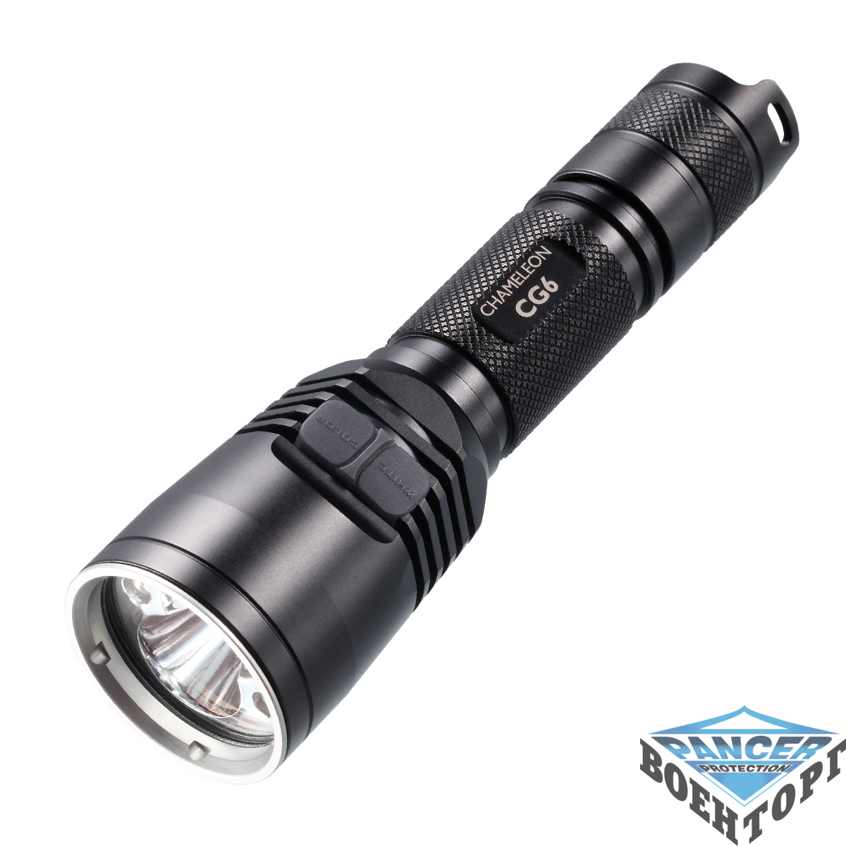 Тактический фонарь Nitecore CG6, который основан на базе двух светодиодов: Белый - Cree XP-G2, мощностью 440 люмен и Зелёный - Cree XP-E на 185 люмен (3000mW). Имеет 15 режимов работы и питается от аккумуляторов типа 1x18650 / 2xCR123A. Уникальная С» серия фонарей - невидимок (Chameleon) от компании Nitecore. Их уникальность заключается в том, что производитель объединил два современных американских светодиода: белый (Cree XP-G2 LED), и яркий цветной светодиод зеленого света (Cree XP-E LED). Они установлены в высокопроизводительном отражателе, что в итоге дает великолепную дальность луча и широкий угол обзора. Основные особенности и инновации фонаря Nitecore CG6 (white + red + RGB): - Благодаря пружинному механизму, фонарь защищен от действия вибрации и перегрузок, которые возникают в результате отдачи при выстреле. Благодаря этому идеально подходит для использования на оружии, в том числе крупнокалиберного. - В фонаре использован уникальный пользовательский интерфейс, благодаря которому фонарь с равной долей удобства можно использовать и как ручной фонарь, и как подствольный. Реализовано благодаря двум кнопкам и световой индикации, которые позволяют: - Предупреждать о смене батареи при низком ее заряде. - Благодаря двум отдельным кнопкам, можно с легкостью осуществлять переключение режимов. - Инновационный рефлектор фонаря вместе с запатентованной технологией второго поколения "Crystal Coating Technology" и известной технологией "PDOT" от Nitecore, позволили получить максимальную интенсивность света 9000cd и дальность потока более 180 метров (ANSI FL1) избегая паразитных засфеток и неэффективного переотражения. - Основный белый свет: USA светодиод Cree XP-G2 (второго поколения), максимальная яркость 440 люмен, производительность 50 000 часов. - Основной зеленый свет: USA светодиод Cree XP-E, максимальная яркость 185 люмен и мощность излучения 3000mW (3Вт.), дальность освещения 170 метров. - Два вспомогательных сигнальных RGB светодиода малой мощности: могут светить красным, зеленым и синим максимально длительное время! - Минеральное сверхчистое стекло с антибликовым покрытием и защитой от царапин. - Корпус выполнен из аэрокосмического сплава алюминия, благодаря чему вес фонаря при надежном и прочном корпусе составляет всего 138 грамм. - Способен непрерывно работать на протяжении 400 часов! - Включение цветного тактического освещения подсветки RGB (красный, зеленый, синий) - Красный цвет используется на охоте и как тактическая подсветка (не слепит глаза в полной темноте). - Зеленый свет используется охотниками, а так же для анализа документов и картографии, когда обычный свет дает засветку и неудобен в использовании. Так же зеленый свет не боятся животные, и он прекрасно подходит для приборов ночного видения. - Синий свет используется для детекции различных следов: шерсти, пятен крови, для охоты и рыбалки. Особенно полезен синий свет для рыбаков! Раба засвеченная синим фонарем ночью, может быть легко поймана при помощи гарпуна. Рыба не боится синего света и не обходит кормушки и поплавки на которые направлен такой световой поток. - Возможность включения комбинированного сигнального режима освещения Red/Blue Light. - Дополнительные режимы работы: стробоскоп, полицейский сигнал тревоги, маячок. - Интегрированная защита от неверной установки (полярности) батарей. - Стальное кольцо, на головной части, защищает фонарь от повреждений. - Стальная клипса с тита