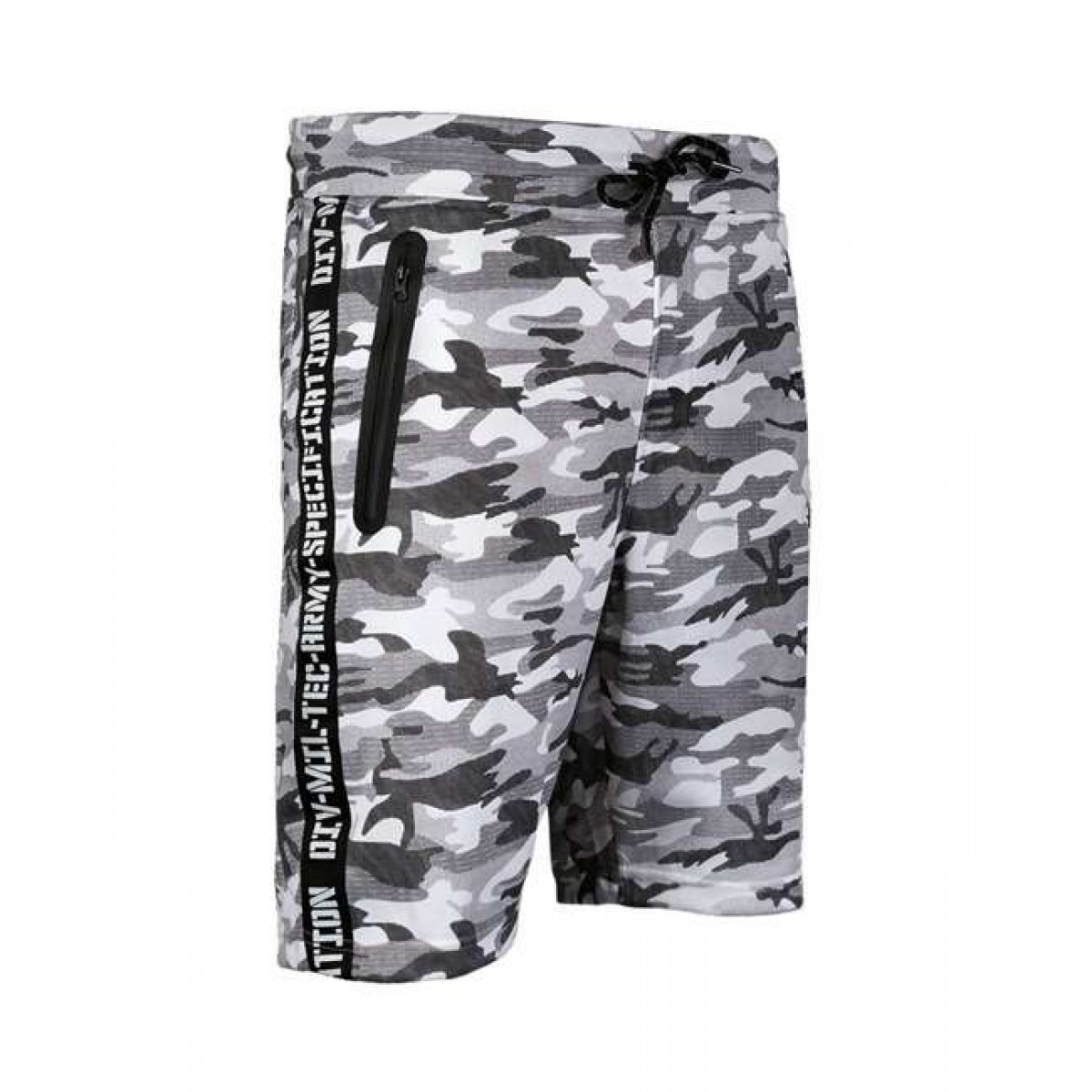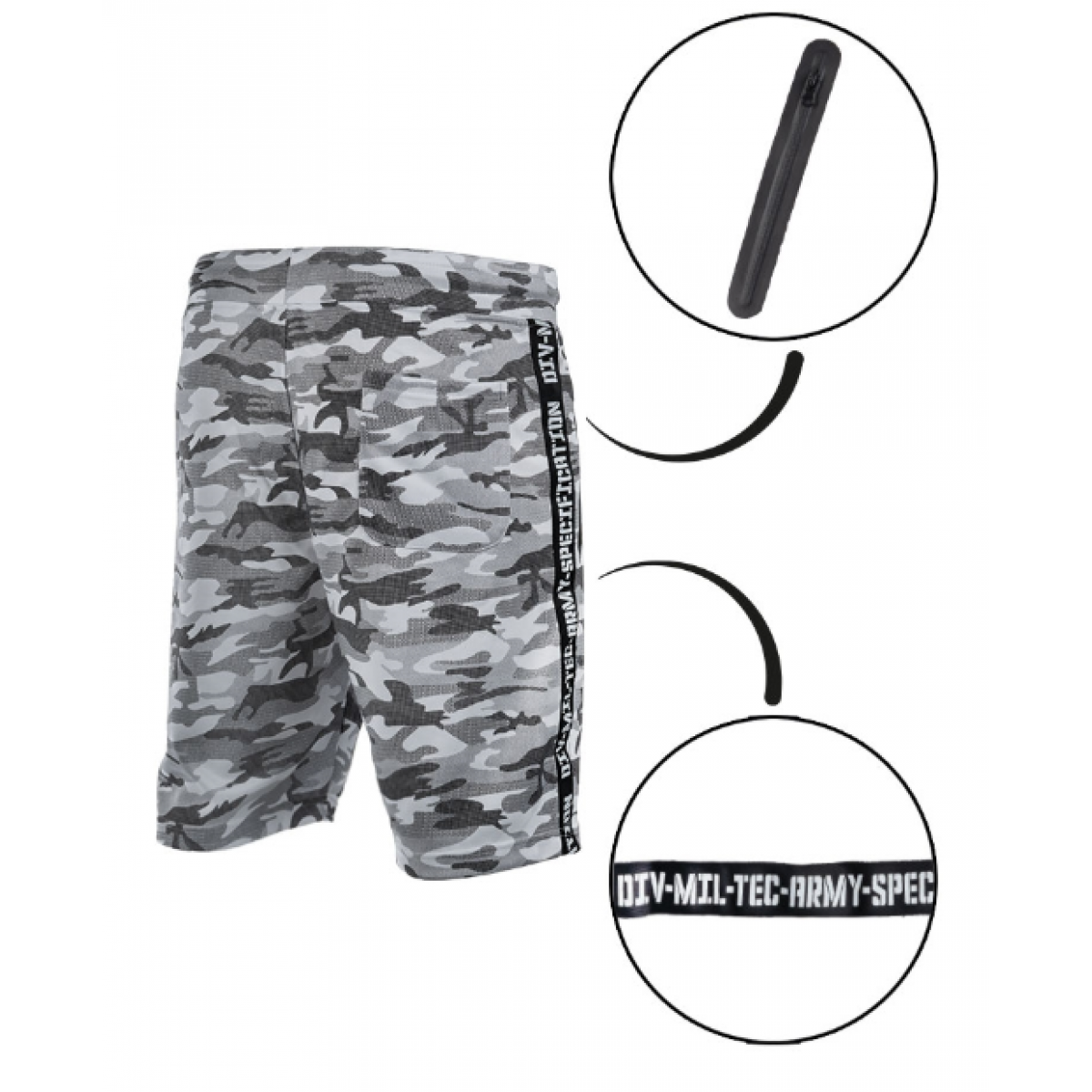 Спортивные шорты из 100% полиэстера для занятий спортом и для повседневной носки. Тянущийся материал и удобный крой. Камуфляжная расцветка и лампасы с надписью "DIV-MIL-TEC-ARMY-SPECIFIKATON" подчеркивают армейский стиль. На поясе широкая резинка с интегрированным шнурком. Водозащитные молнии на двух передних врезных карманах. 1 накладной карман на попе.