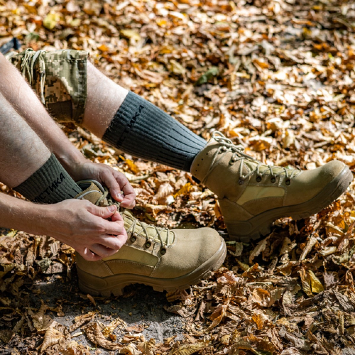 Одним из важнейших факторов работоспособности для военнослужащих является комфорт ног. Поэтому ни в коем случае не следует недооценивать выбор качественных носков. Ведь они действительно способны существенно повлиять на общее самочувствие и выносливость. Летние носки от «Баллистики» разработаны и протестированы для использования в сложных полевых условиях. Благодаря комбинированному составу и особому плетению они отлично отводят влагу, поддерживают оптимальную температуру, предотвращают натирания и мозоли. Особенности товара К преимуществам наших треккинговых носков стоит отнести следующие: Хлопок обеспечивает мягкость, воздухопроницаемость и быстрое поглощение влаги, полиамид добавляет прочности и износостойкости, а благодаря эластану изделие плотно прилегает к ноге. Участки, на которые приходится наибольшее давление – пятка и мысок, – укреплены нейлоновыми нитями, поэтому эффективно противодействуют протиранию. А значит, носки прослужат дольше. Широкая фиксационная резинка с усиленным двойным бортом способствует удобной посадке на голени и предотвращает сползание носков. Есть несколько зон вентиляции для улучшения терморегуляции и поперечный бандаж для надежной фиксации на ступне. Амортизационное махровое плетение на стопе поглощает удары во время ходьбы или бега, а это уменьшает утомляемость ног. Эти носки немного ниже штатных, которые выдаются в ВСУ, и не так пережимают голень. Специально разработаны под высокие военные берцы, также подходят для демисезонной обуви. Технические характеристики Состав: 78% – хлопок; 17% – полиамид; 5% – эластан. Сезонность: летние, демисезонные. Назначение: военные, туристические. Количество: 1 пара.Отзывы о Носки трекинговые ВЫСОКИЕ "Баллистика" 1 пара 37-39