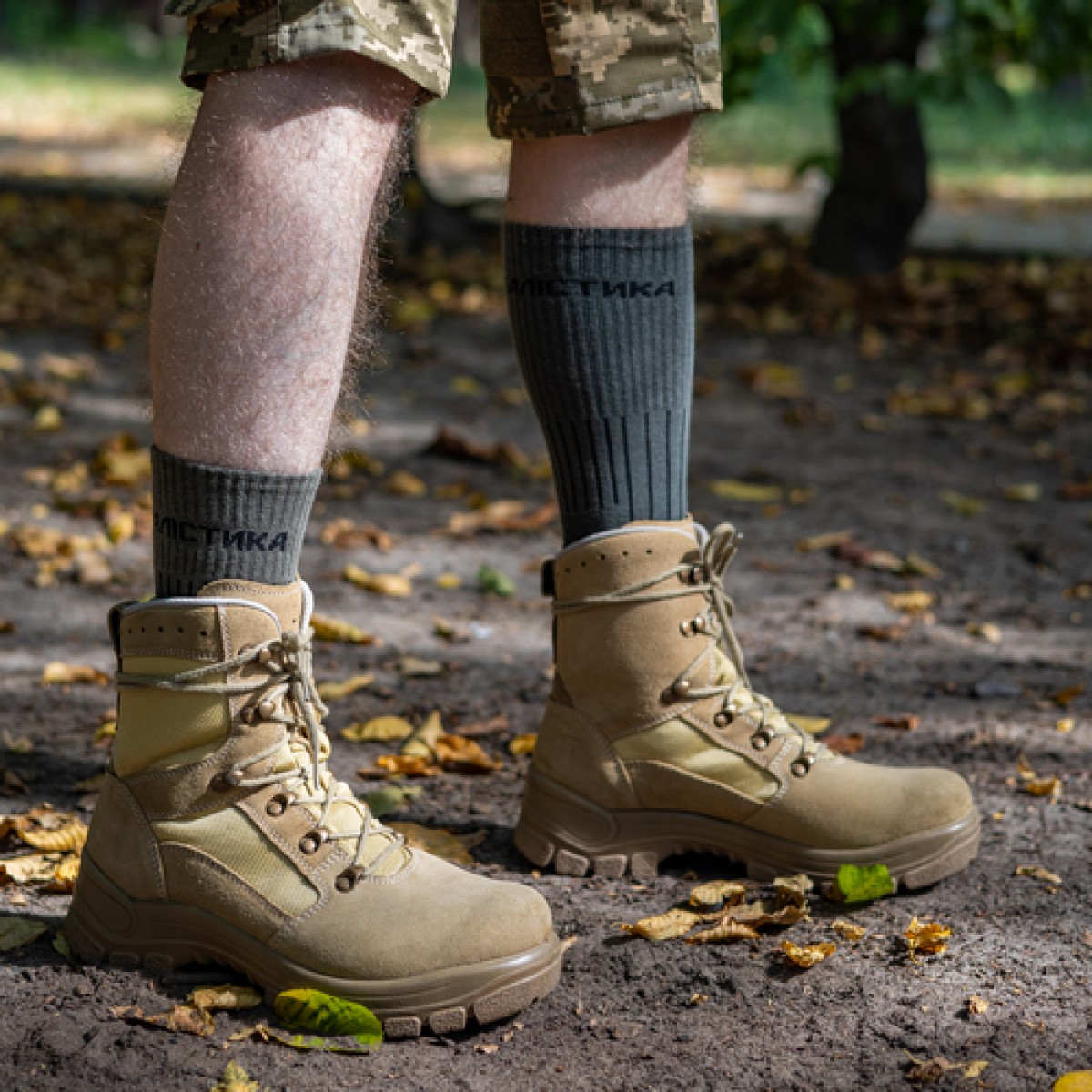 Одним из важнейших факторов работоспособности для военнослужащих является комфорт ног. Поэтому ни в коем случае не следует недооценивать выбор качественных носков. Ведь они действительно способны существенно повлиять на общее самочувствие и выносливость. Летние носки от «Баллистики» разработаны и протестированы для использования в сложных полевых условиях. Благодаря комбинированному составу и особому плетению они отлично отводят влагу, поддерживают оптимальную температуру, предотвращают натирания и мозоли. Особенности товара К преимуществам наших треккинговых носков стоит отнести следующие: Хлопок обеспечивает мягкость, воздухопроницаемость и быстрое поглощение влаги, полиамид добавляет прочности и износостойкости, а благодаря эластану изделие плотно прилегает к ноге. Участки, на которые приходится наибольшее давление – пятка и мысок, – укреплены нейлоновыми нитями, поэтому эффективно противодействуют протиранию. А значит, носки прослужат дольше. Широкая фиксационная резинка с усиленным двойным бортом способствует удобной посадке на голени и предотвращает сползание носков. Есть несколько зон вентиляции для улучшения терморегуляции и поперечный бандаж для надежной фиксации на ступне. Амортизационное махровое плетение на стопе поглощает удары во время ходьбы или бега, а это уменьшает утомляемость ног. Эти носки немного ниже штатных, которые выдаются в ВСУ, и не так пережимают голень. Специально разработаны под высокие военные берцы, также подходят для демисезонной обуви. Технические характеристики Состав: 78% – хлопок; 17% – полиамид; 5% – эластан. Сезонность: летние, демисезонные. Назначение: военные, туристические. Количество: 1 пара.Отзывы о Носки трекинговые ВЫСОКИЕ "Баллистика" 1 пара 46-48