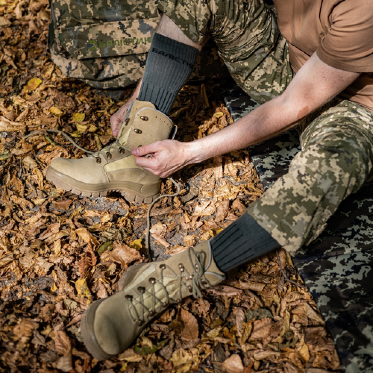 Одним из ключевых факторов выносливости для военных является комфорт ног. Поэтому ни в коем случае не пренебрегайте подбором качественных носков, которые способны существенно повлиять на ваше общее самочувствие и работоспособность. Летние носки от «Баллистики» разработаны и протестированы для использования в сложных полевых условиях. Благодаря сочетанию натуральных и синтетических волокон и особому плетению они хорошо отводят влагу, предотвращают перегревание, натирания и мозоли. Особенности товара К важным свойствам наших треккинговых носков относятся следующие: Хлопок делает их приятными на ощупь и «дышащими», полиамид – прочными и износостойкими, а эластан способствует анатомическому облеганию ноги. Зоны, которые испытывают наибольшую нагрузку – пятка и мысок, – укреплены нейлоновыми нитями для противодействия протиранию. А значит, носки прослужат дольше. Широкая фиксирующая резинка с усиленным двойным бортом способствует плотной посадке на голени и предотвращает сползание носков. В нескольких критических местах расположены вентиляционные вставки, улучшающие терморегуляцию, а удобный поперечный бандаж надежно фиксирует носок на стопе. Амортизационное махровое плетение на ступне поглощает удары при ходьбе или беге, а это уменьшает утомляемость ног. Эти носки немного ниже штатных, выдаваемых бойцам ВСУ, и не так передавливают голень. Специально разработаны под высокие военные берцы, также подходят для демисезонной обуви. Выгодное предложение! Вы можете приобрести удобные наборы по четыре пары, скрепленные стропой олива; стропа в подарок. Технические характеристики Состав: 78% – хлопок; 17% – полиамид; 5% – эластан. Сезонность: летние, демисезонные. Назначение: военные, туристические. Количество в наборе: 4 пары.Отзывы о Носки трекинговые ВЫСОКИЕ "Баллистика" комплект 4 пары 37-39