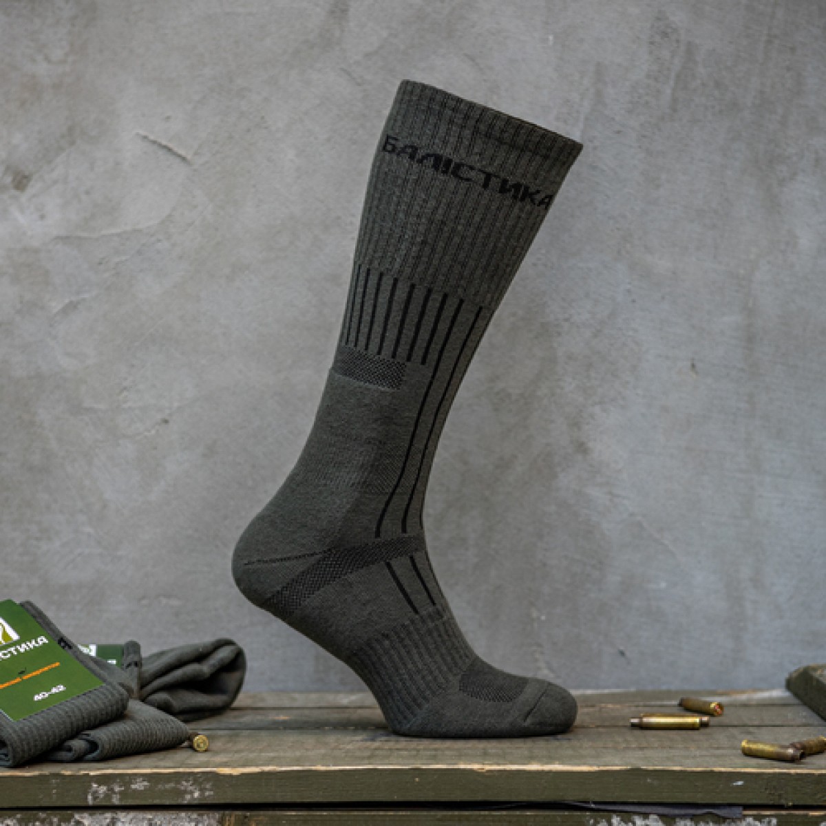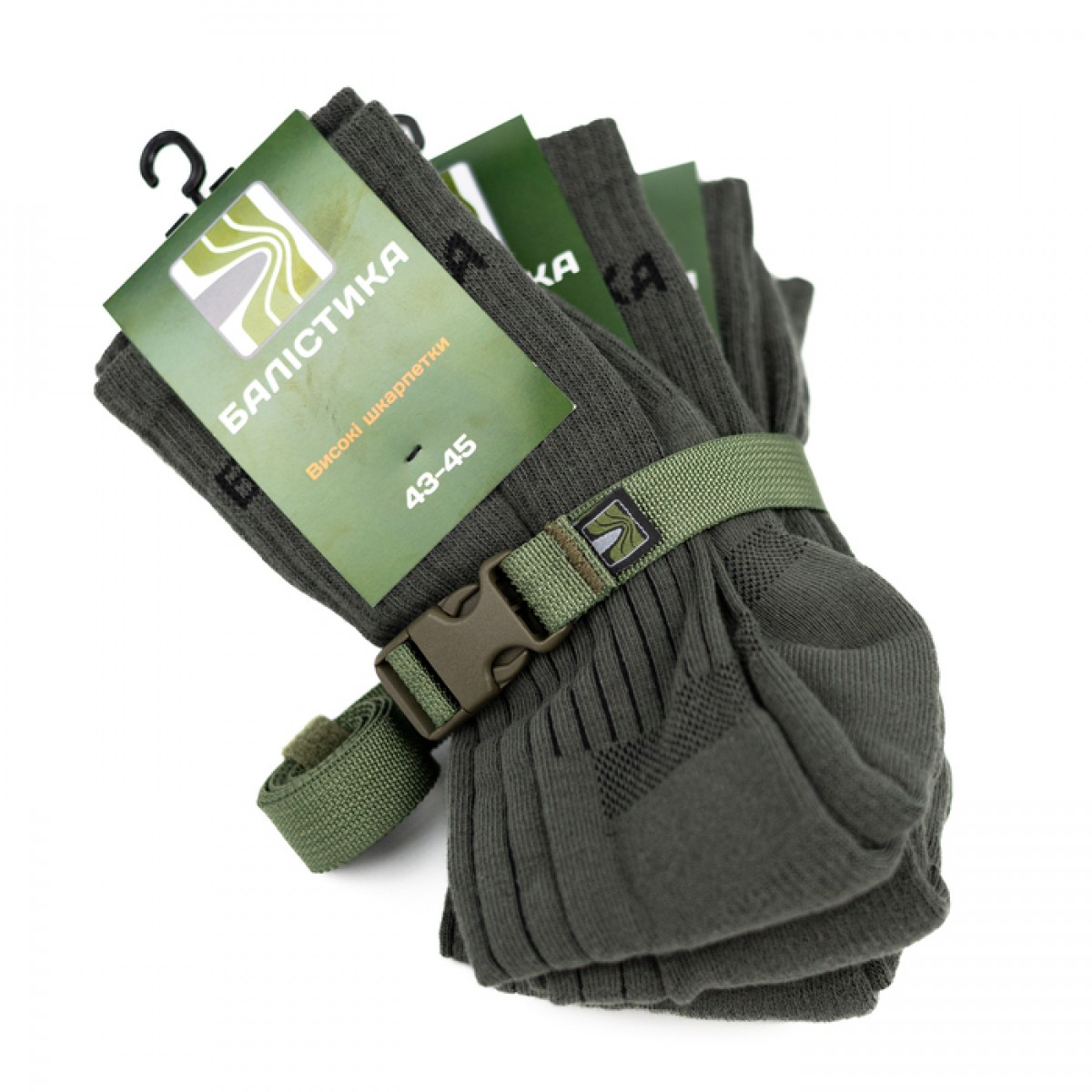 Одним из ключевых факторов выносливости для военных является комфорт ног. Поэтому ни в коем случае не пренебрегайте подбором качественных носков, которые способны существенно повлиять на ваше общее самочувствие и работоспособность. Летние носки от «Баллистики» разработаны и протестированы для использования в сложных полевых условиях. Благодаря сочетанию натуральных и синтетических волокон и особому плетению они хорошо отводят влагу, предотвращают перегревание, натирания и мозоли. Особенности товара К важным свойствам наших треккинговых носков относятся следующие: Хлопок делает их приятными на ощупь и «дышащими», полиамид – прочными и износостойкими, а эластан способствует анатомическому облеганию ноги. Зоны, которые испытывают наибольшую нагрузку – пятка и мысок, – укреплены нейлоновыми нитями для противодействия протиранию. А значит, носки прослужат дольше. Широкая фиксирующая резинка с усиленным двойным бортом способствует плотной посадке на голени и предотвращает сползание носков. В нескольких критических местах расположены вентиляционные вставки, улучшающие терморегуляцию, а удобный поперечный бандаж надежно фиксирует носок на стопе. Амортизационное махровое плетение на ступне поглощает удары при ходьбе или беге, а это уменьшает утомляемость ног. Эти носки немного ниже штатных, выдаваемых бойцам ВСУ, и не так передавливают голень. Специально разработаны под высокие военные берцы, также подходят для демисезонной обуви. Выгодное предложение! Вы можете приобрести удобные наборы по четыре пары, скрепленные стропой олива; стропа в подарок. Внимание! Цвет стропы может изменяться в зависимости от наличия на складе. Технические характеристики Состав: 78% – хлопок; 17% – полиамид; 5% – эластан. Сезонность: летние, демисезонные. Назначение: военные, туристические. Количество в наборе: 4 пары.Отзывы о Носки трекинговые ВЫСОКИЕ "Баллистика" комплект 4 пары 43-45