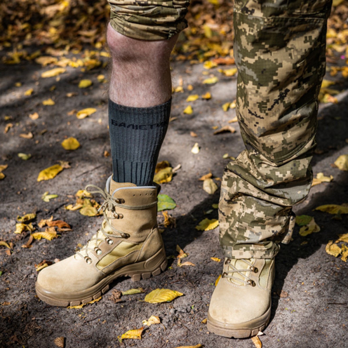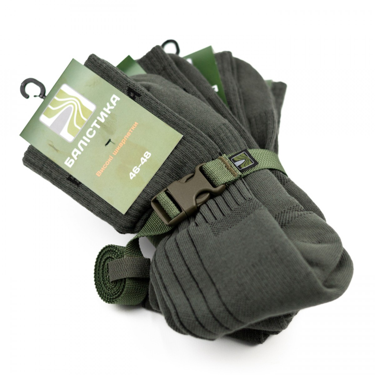 Одним из ключевых факторов выносливости для военных является комфорт ног. Поэтому ни в коем случае не пренебрегайте подбором качественных носков, которые способны существенно повлиять на ваше общее самочувствие и работоспособность. Летние носки от «Баллистики» разработаны и протестированы для использования в сложных полевых условиях. Благодаря сочетанию натуральных и синтетических волокон и особому плетению они хорошо отводят влагу, предотвращают перегревание, натирания и мозоли. Особенности товара К важным свойствам наших треккинговых носков относятся следующие: Хлопок делает их приятными на ощупь и «дышащими», полиамид – прочными и износостойкими, а эластан способствует анатомическому облеганию ноги. Зоны, которые испытывают наибольшую нагрузку – пятка и мысок, – укреплены нейлоновыми нитями для противодействия протиранию. А значит, носки прослужат дольше. Широкая фиксирующая резинка с усиленным двойным бортом способствует плотной посадке на голени и предотвращает сползание носков. В нескольких критических местах расположены вентиляционные вставки, улучшающие терморегуляцию, а удобный поперечный бандаж надежно фиксирует носок на стопе. Амортизационное махровое плетение на ступне поглощает удары при ходьбе или беге, а это уменьшает утомляемость ног. Эти носки немного ниже штатных, выдаваемых бойцам ВСУ, и не так передавливают голень. Специально разработаны под высокие военные берцы, также подходят для демисезонной обуви. Выгодное предложение! Вы можете приобрести удобные наборы по четыре пары, скрепленные стропой олива; стропа в подарок. Внимание! Цвет стропы может изменяться в зависимости от наличия на складе. Технические характеристики Состав: 78% – хлопок; 17% – полиамид; 5% – эластан. Сезонность: летние, демисезонные. Назначение: военные, туристические. Количество в наборе: 4 пары.Отзывы о Носки трекинговые ВЫСОКИЕ "Баллистика" комплект 4 пары 46-48