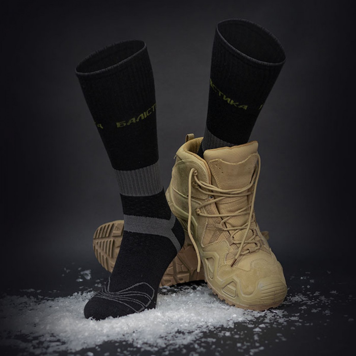 Комфорт ног – один из ключевых факторов работоспособности военнослужащих. Поэтому качество носков имеет решающее значение – они способны значительно улучшить общее самочувствие и выносливость бойца. Зимние носки от «Баллистики» специально разработаны и протестированы для тяжелых полевых условий. Их комбинированный состав и особое плетение способствуют отличному потоотводу, а благодаря добавлению шерсти мериноса обеспечивают превосходную теплорегуляцию. Особенности товара К преимуществам наших треккинговых носков относятся следующие: Шерсть хорошо сохраняет тепло даже в экстремальные морозы до -20 С°, отводит лишнюю влагу и «дышит». Акрил обеспечивает износостойкость и простоту ухода. Полиамид дополнительно усиливает прочность, а эластан способствует хорошей посадке на ноге. Участки, на которые приходится наибольшая нагрузка – пятка и мысок, – укреплены нейлоновыми нитями, поэтому эффективно противодействуют протиранию. Так что носки прослужат дольше. Широкая фиксирующая резинка с усиленным двойным бортом позволяет носкам удобно сидеть на голени без сползания. А горизонтальный и вертикальный бандаж служит надежной фиксации на ступне. Вентиляционные зоны в ключевых местах улучшают терморегуляцию. Амортизационное махровое плетение на стопе смягчает удары во время ходьбы или бега, а это уменьшает усталость и боль в ногах. Подходят для демисезонной и зимней обуви. Эти носки ниже штатных, выдаваемых в ВСУ, и не так пережимают голень. Технические характеристики Состав: 32% – шерсть мериноса; 48% – акрил; 15% – полиамид; 5% – эластан. Сезонность: зимние, демисезонные. Назначение: военные, туристические. Количество: 1 пара.Отзывы о Носки трекинговые ЗИМНИЕ "Баллистика" 1 пара 40-42 (Зеленый)
