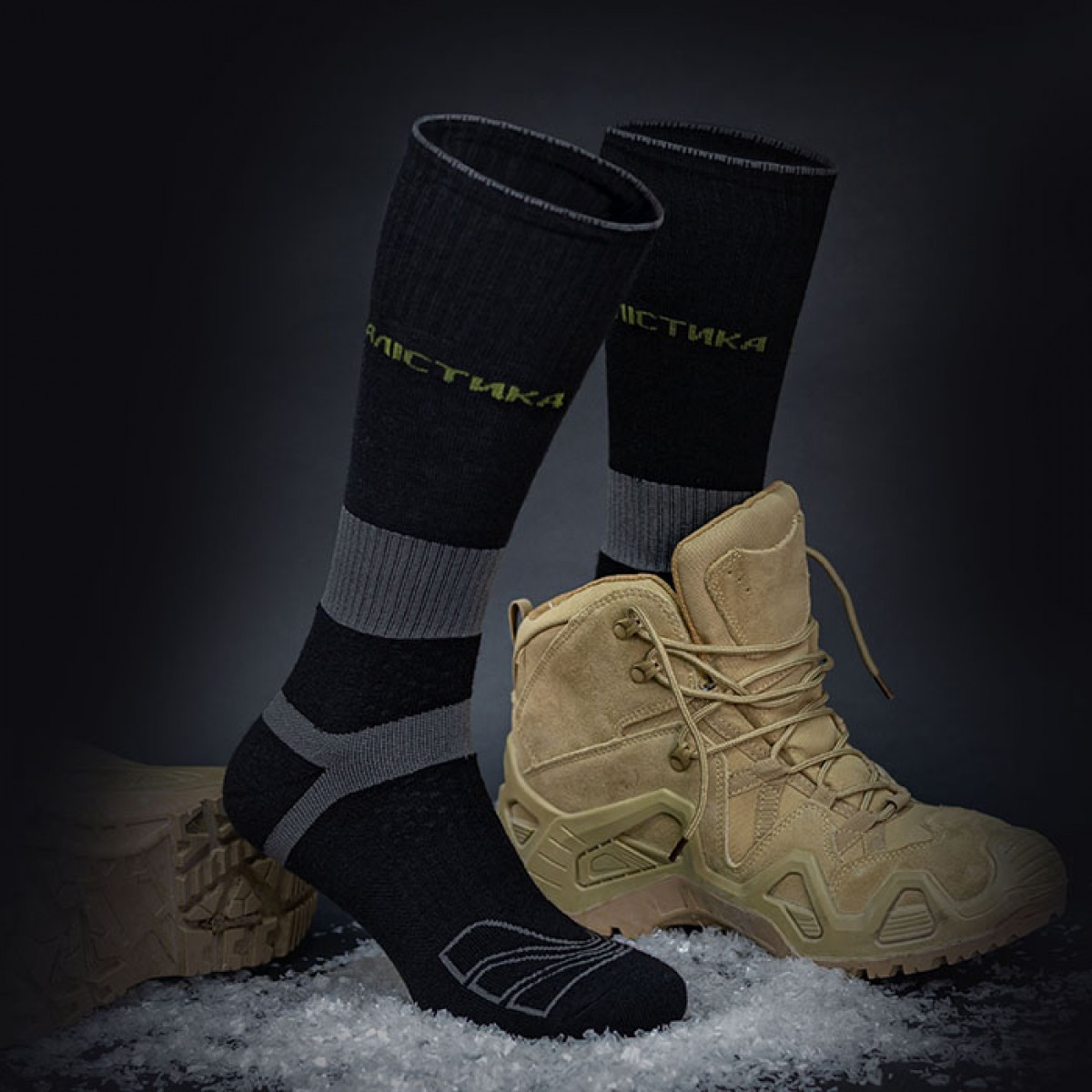 Комфорт ног – один из ключевых факторов работоспособности военнослужащих. Поэтому качество носков имеет решающее значение – они способны значительно улучшить общее самочувствие и выносливость бойца. Зимние носки от «Баллистики» специально разработаны и протестированы для тяжелых полевых условий. Их комбинированный состав и особое плетение способствуют отличному потоотводу, а благодаря добавлению шерсти мериноса обеспечивают превосходную теплорегуляцию. Особенности товара К преимуществам наших треккинговых носков относятся следующие: Шерсть хорошо сохраняет тепло даже в экстремальные морозы до -20 С°, отводит лишнюю влагу и «дышит». Акрил обеспечивает износостойкость и простоту ухода. Полиамид дополнительно усиливает прочность, а эластан способствует хорошей посадке на ноге. Участки, на которые приходится наибольшая нагрузка – пятка и мысок, – укреплены нейлоновыми нитями, поэтому эффективно противодействуют протиранию. Так что носки прослужат дольше. Широкая фиксирующая резинка с усиленным двойным бортом позволяет носкам удобно сидеть на голени без сползания. А горизонтальный и вертикальный бандаж служит надежной фиксации на ступне. Вентиляционные зоны в ключевых местах улучшают терморегуляцию. Амортизационное махровое плетение на стопе смягчает удары во время ходьбы или бега, а это уменьшает усталость и боль в ногах. Подходят для демисезонной и зимней обуви. Эти носки ниже штатных, выдаваемых в ВСУ, и не так пережимают голень. Технические характеристики Состав: 32% – шерсть мериноса; 48% – акрил; 15% – полиамид; 5% – эластан. Сезонность: зимние, демисезонные. Назначение: военные, туристические. Количество: 1 пара.Отзывы о Носки трекинговые ЗИМНИЕ "Баллистика" 1 пара 43-45 (Серый)