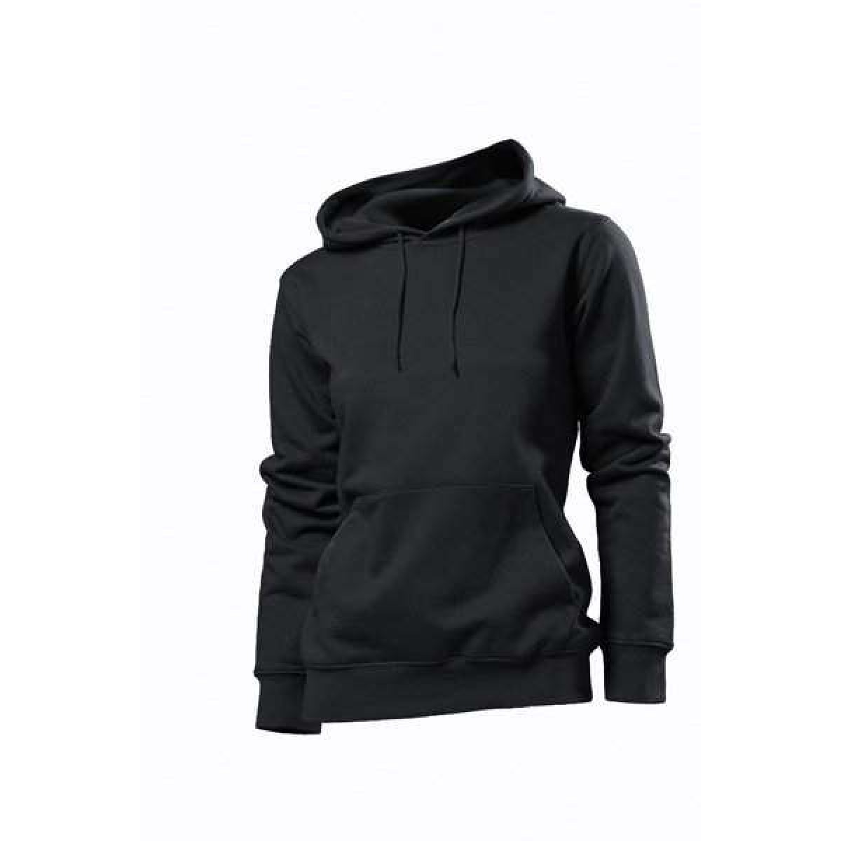 Худи женское черный ST4110Прокладка для укрепления воротника, передний карман, подкладка из флиса с начесом, шнурок того же цвета, боковые швы, эластичные манжеты и пояс.