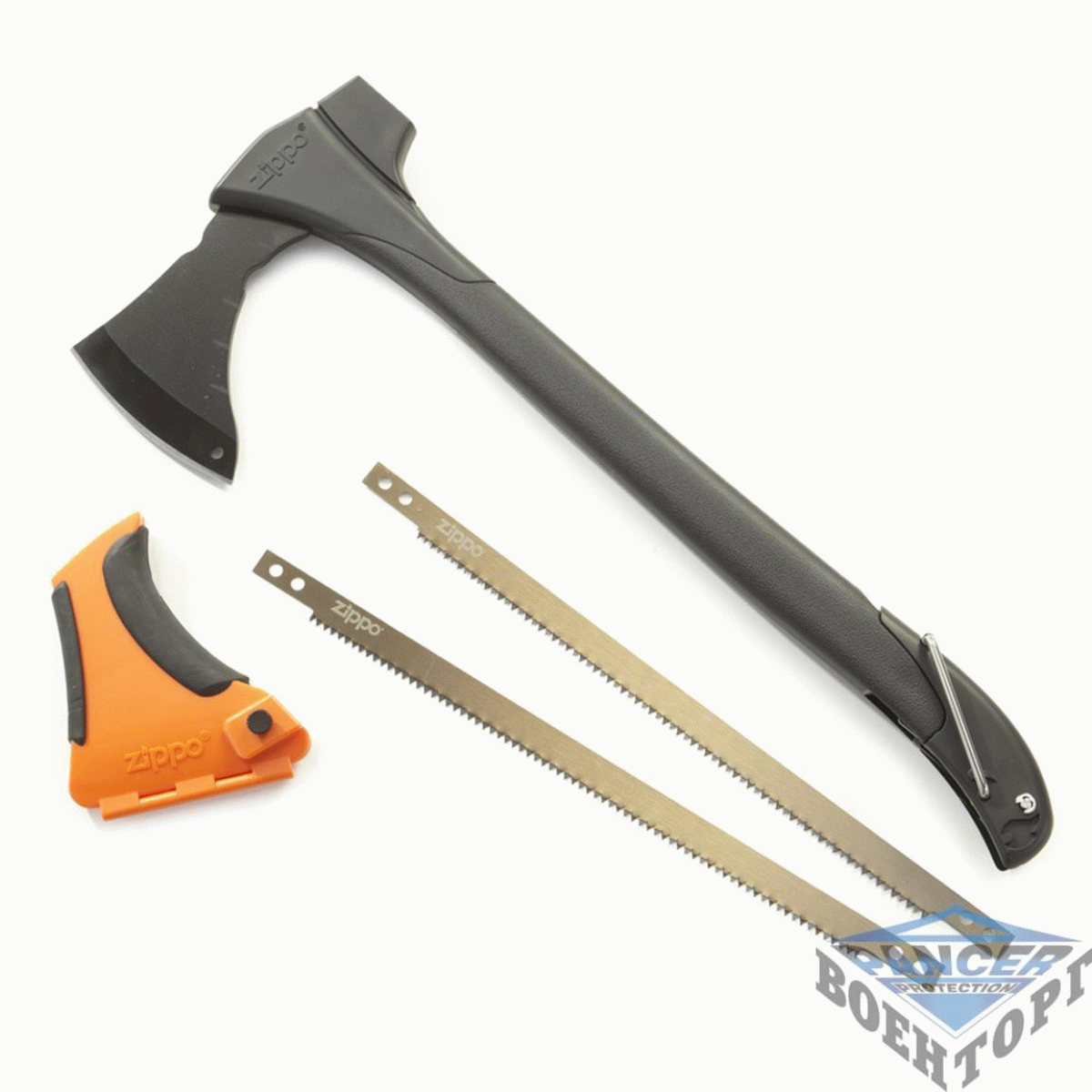 Многофункциональный топор от Zippo. Топор, молоток, пила и инструмент для извлечения колышков. Комплектуется тремя полотнами для поперечной пилы по дереву. Защитный кожух для транспортировки является частью пилы. Десяти сантиметровые ветки дуба не проблема для данного монстра.
