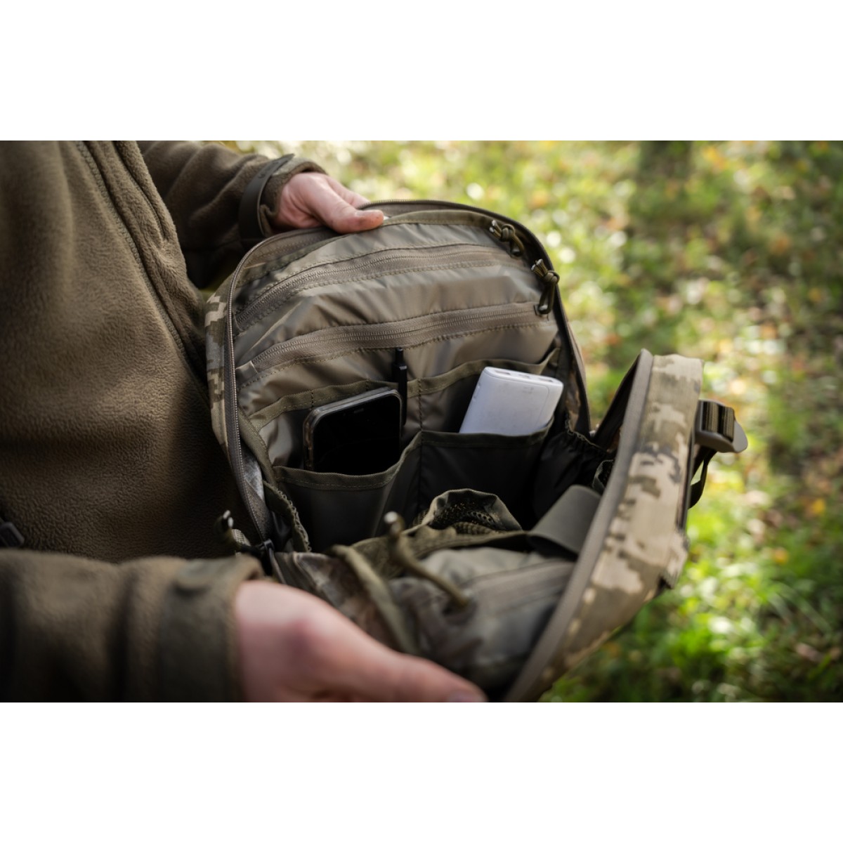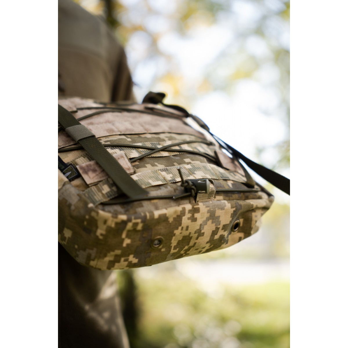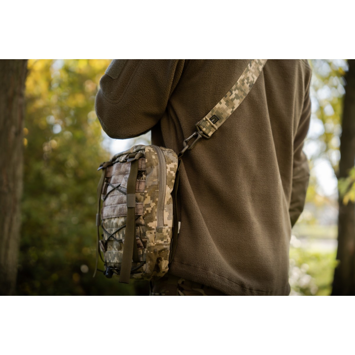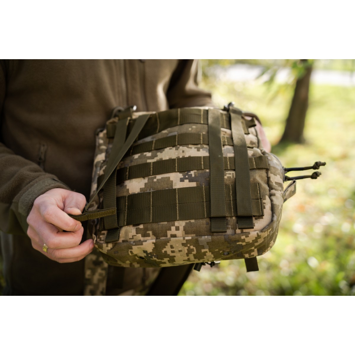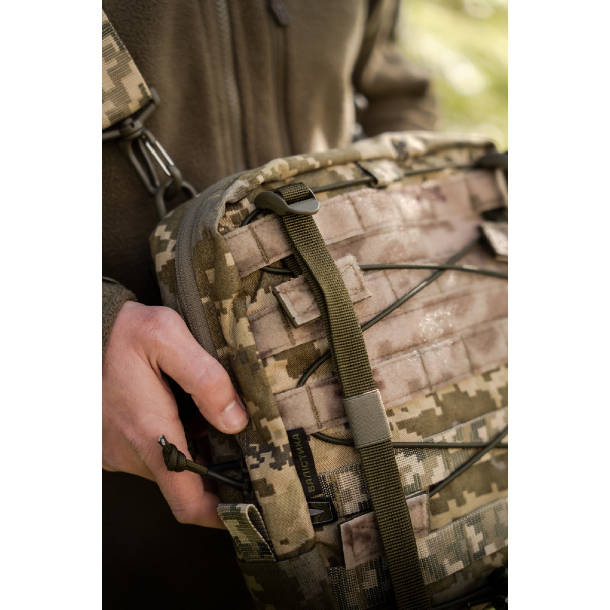 В условиях стресса и дефицита времени на поле боя критически важно упорядочить тактический инвентарь и медицинские средства. Часто это определяет успех операции и даже спасает жизнь. С сумкой-органайзером от «Баллистики» каждой вашей вещи будет отведено свое место, а ее поиск не будет отбирать драгоценные секунды. Главное – самим запомнить, где что лежит. Особенности товара Мы позаботились о том, чтобы хаотичное нагромождение важных вещей больше не доставляло вам хлопот, благодаря ряду полезных функций. Сумка состоит из одного основного отделения на молнии, в котором содержится множество больших и маленьких карманов и эластичных креплений. Два кармана на молниях (27×26 и 19×26 см) расположены на задней стенке и наслоены друг на друга. Они достаточно глубокие и широкие, чтобы вместить документы, карты, тактическую канцелярию и пр. Снаружи на них нашиты два ряда меньших карманов, разделенных швами на четыре отсека. Причем один из этих отсеков разделен на три меньшие секции. Еще один закрытый карман (27×26 см) нашит на переднюю стенку и внутри имеет три ряда открытых кармашков разного размера, также разделенных швами. Сверху над этим карманом помещена эластичная петля размером 4×6 см, куда можно установить турникет. В открытые прозрачные карманы из 2D-сетки можно класть самые востребованные вещи, к которым нужен регулярный быстрый доступ. Внутри одного из них помещена эластичная лента, поделенная швами на три отрезка. Сумка оснащена съемной лямкой, длина которой регулируется с помощью двухщелевой пряжки (от 76 до 142 см). Лямка, в свою очередь, комплектуется накладным демпфером (7,5×32 см), смягчающим давление на плечо. Четыре внешние петли на системе MOLLE позволяют прикрепить на нужный уровень ремешок от «Ладника» для дополнительной фиксации на поясе (ремешок в комплекте не идет). Если нет необходимости носить изделие на плече или через плечо, можно пришнуровать его к плитоноске на четыре стропы системы MOLLE. Спереди на сумке также находятся ячейки MOLLE, к которым можно прикрепить аптечку со стандартным набором IFAK и один-два турникетных подсумка. В три ряда ячеек и пространство между ними интегрирована липучка, которая формирует собой сплошную панель 12×16 см. На фасаде, кроме ячеек, реализованы два вида внешних креплений. Через крайние боковые ячейки накрест вплетен шоккордовый шнурок, который регулируется пластиковым фиксатором. В крайние верхние и нижние ячейки продеты две узкие стропы с ограничителями, регулируемые трехщелевыми пряжками и закрепленные резинками. И шнурок, и стропы пригодны для фиксации дождевика, каремата или других габаритных вещей. При необходимости оба крепления можно снять. Внутренние швы усилены отделочной лентой. Она также служит бортиком для всех открытых карманов, кроме одного из прозрачных карманов, где бортик держит эластичная тесьма. Два люверса на дне способствуют вентиляции и отводу лишней влаги. Благодаря этим отверстиям внутри также не задерживается песок или мелкий мусор. Технические характеристики Внешний материал: Nylon 500D/Cordura 500D. Внутренний материал: Oxford 340D, 2D-сетка. Липучка: Velcro. Демпферная накладка: 3D-сетка (200-300 г/м2), слой из пенополиэтилена (5 мм). Ременная стропа: полиамид (2; 2,5; 4 см). Фурнитура: D-образные полукольца, двухщелевые и трехщелевые пряжки, поворотные карабины, фиксатор, молнии, латунные лю