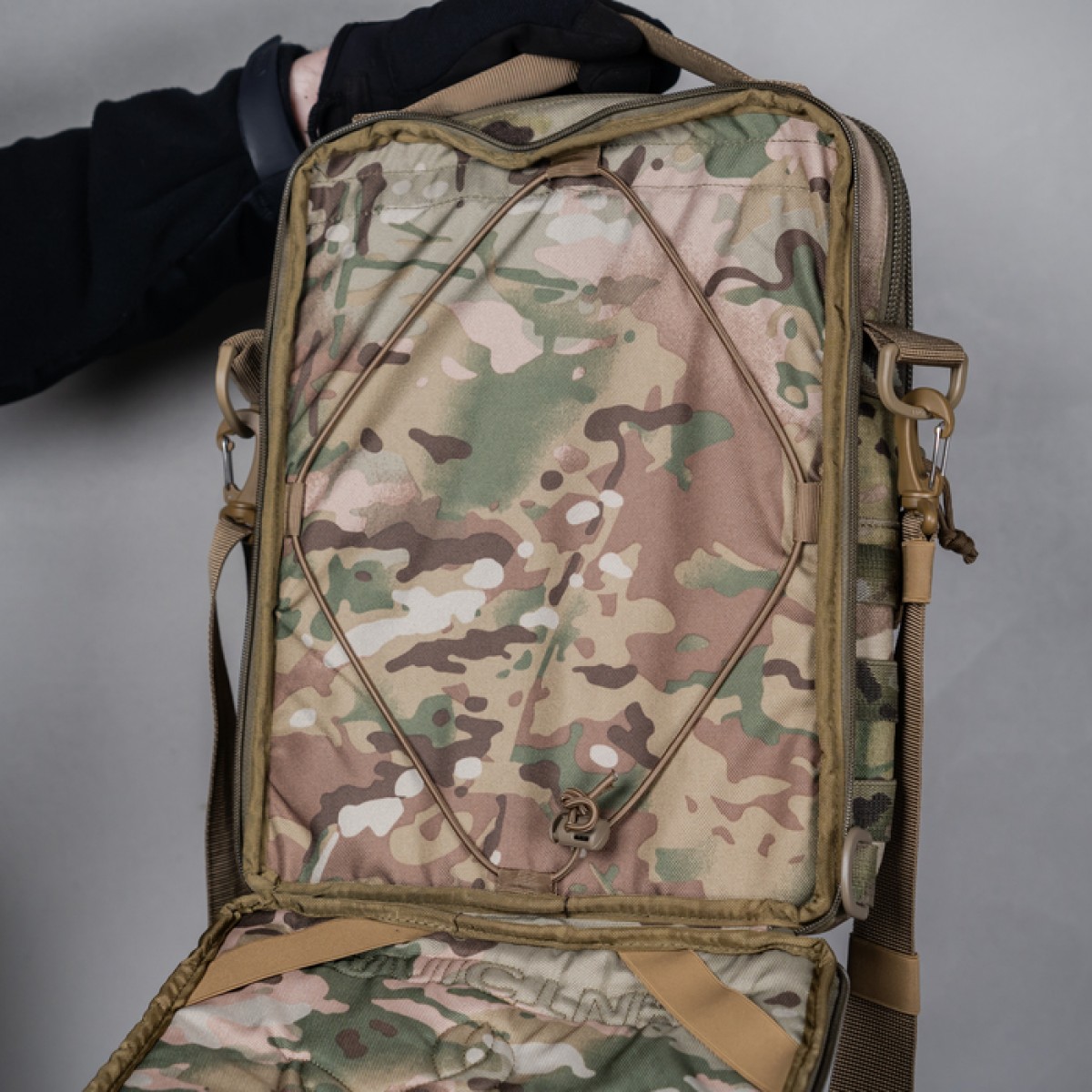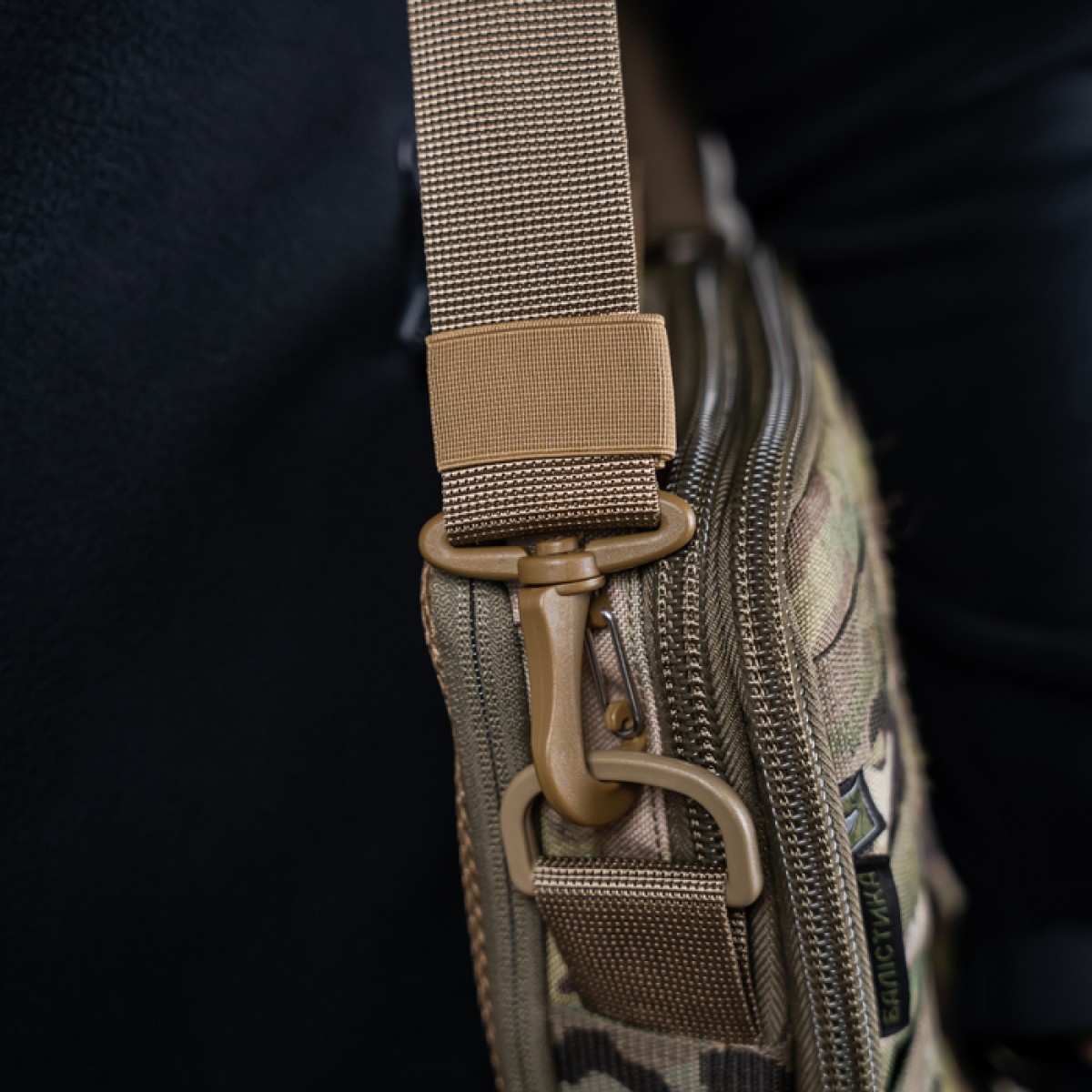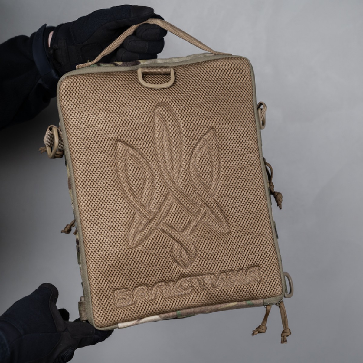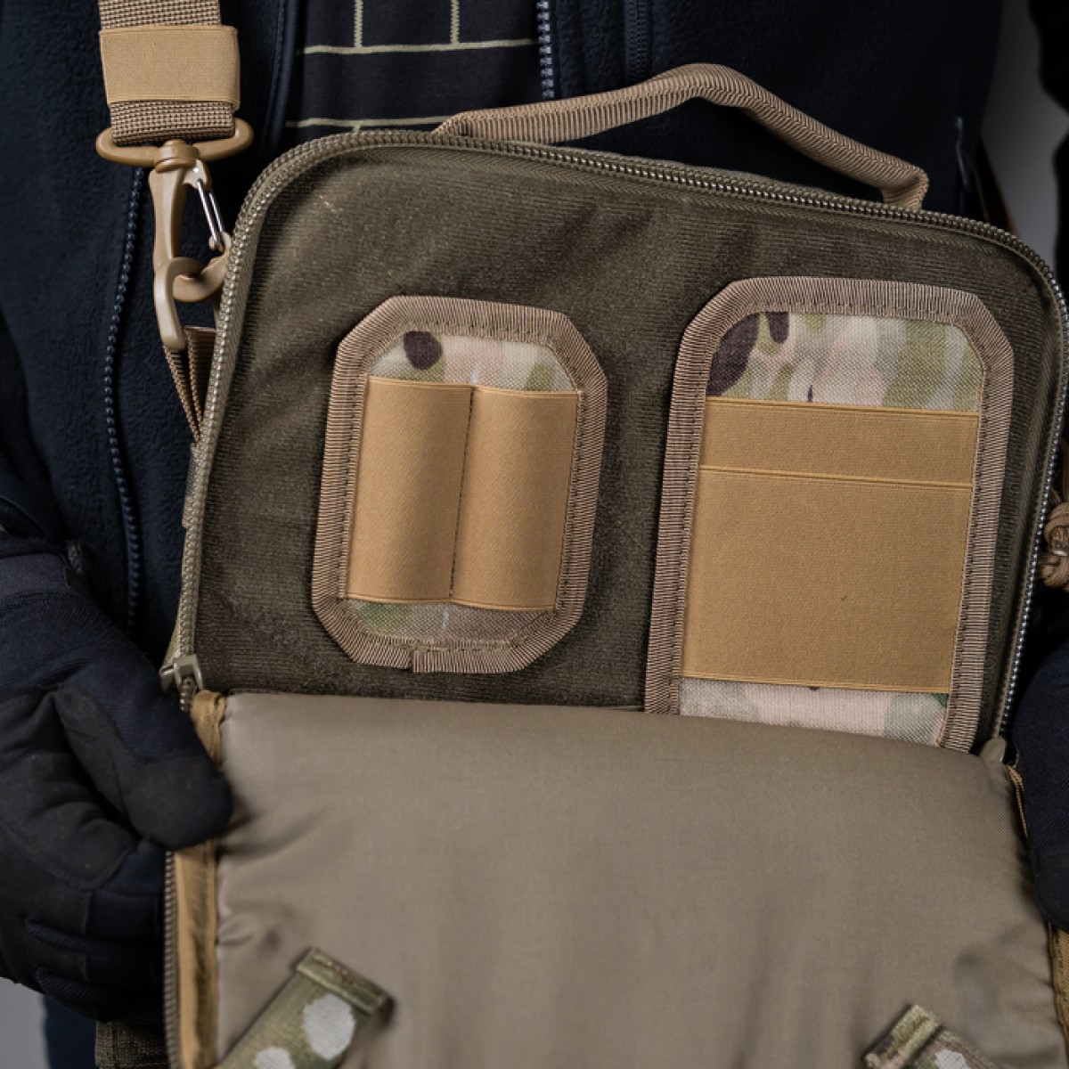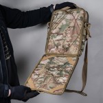 Сумка-планшет предназначена прежде всего для использования в служебных целях работниками силовых структур (ВСУ, СБУ, спецподразделения, прокуратура, полиция, охранные организации). Однако она также отлично подойдет людям, которые любят милитари-стиль и вещи с повышенной функциональностью. Особенности товара Офицерский планшет состоит из трех основных отделений и имеет множество полезных функций: Заднее отделение предназначено для планшета, нетбука или ноутбука с диагональю до 14". Его задняя стенка оснащена четырьмя уголками из эластичной ленты, в которые удобно вставлять бумаги формата А4. Передняя – эластичным шнуром с фиксатором, продетым через четыре петли в виде ромба, куда и устанавливается устройство. Отдел раскрывается с трех сторон до самого дна, чтобы обеспечить легкий доступ к креплениям и технике. Демпферы в обеих стенках и дне рюкзака защищают ее от повреждений. Среднее отделение приспособлено для хранения карт и документов, ведь в отсеках в обеих его стенках (27×33 см) вставлены пластиковые листы, которые не дают им помяться. Кроме этих отсеков, здесь также есть отдельный карман (27×30 см), в котором можно хранить, например, тактическую канцелярию. Переднее отделение создано для короткоствольного оружия и быстрого доступа к нему. Его задняя стенка наполовину покрыта мягким велкро-полотном, к которому крепятся две кобуры: одна для оружия, вторая – для двух магазинов под него. Также здесь есть скрытый отсек, который расположен под перепонкой, край которой также фиксируется на липучку. При необходимости ее можно отлепить и объединить обе части отделения в одно полноразмерное. Передняя стенка также содержит демпфер и изнутри покрыта скользящей тканью, которая облегчает извлечение оружия. К ее верхним углам пришиты две петли, которые можно использовать для быстрого раскрытия отделения, если оставить одну из них снаружи между двумя бегунками – левую или правую в зависимости от того, какая рука рабочая. Снаружи на передней панели рюкзака помещен объемный карман (23×15×4 см) с клапаном, который закрывается на фастекс. Он оснащен органайзером – перегородкой из 2D-сетки и эластичной лентой с пятью отрезками. Стропа на фастексе имеет небольшой запас длины (6 см), который позволяет регулировать уровень закрытия клапана в зависимости от наполнения кармана. Клапан также функциональный и содержит кармашек (26×15 см) на молнии, в котором есть карабин на пружине для фиксации ключей. Под клапаном помещена еще одна молния – она дает доступ к скрытому отсеку в переднем отделении. Над внешними карманами и на боковинах нашиты ячейки MOLLE в три ряда, на которые можно пришнуровать несколько подсумков. Во фронтальные ячейки интегрирована велкро-панель (12×7,5 см) для патчей/шевронов. Еще одна полоска липучки (12×2,5 см) нашита на клапанном кармане. Сумка поставляется с удобным плечевым ремнем, который регулируется по длине и может быть трансформирован в лямки рюкзака. Для его крепления в виде лямок на нижней части боковин и сверху на задней панели помещены полукольца. Ремень оснащен подвижной демпферной накладкой (34×8 см), которая уменьшает давление на плечо. При необходимости ее можно снять или добавить еще одну. Задняя панель планшета покрыта 3D-сеткой, которая способствует вентиляции и предотвращает перегрев спины при ношении его в качеств