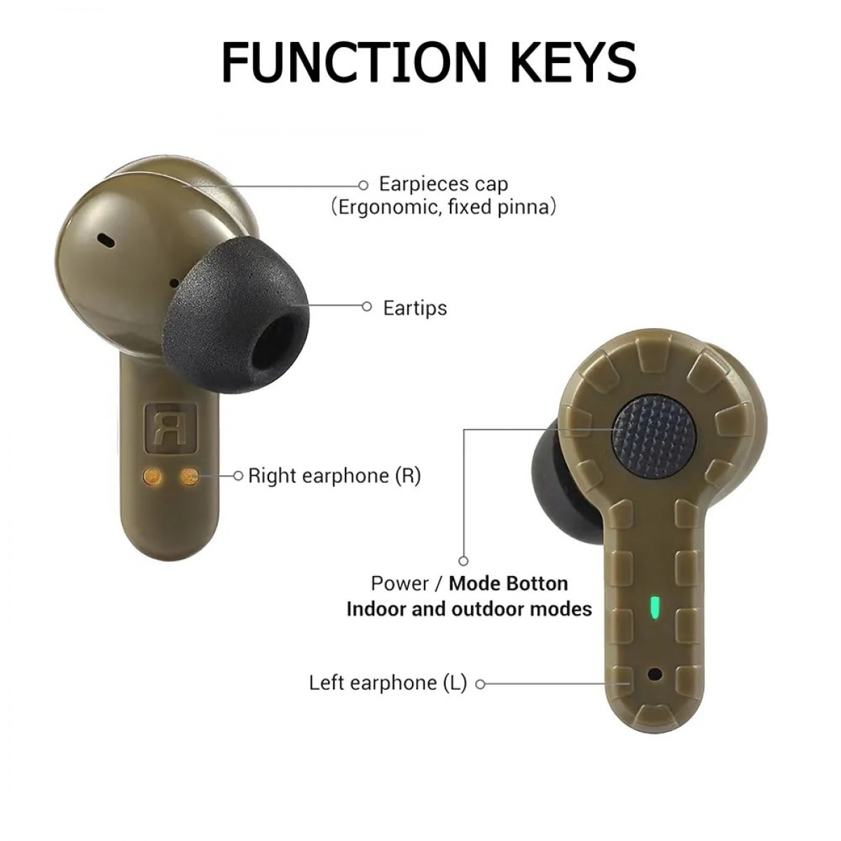 ДВА РЕЖИМИ ШУМОПОДАВАННЯ. Електронні навушники мають два режими шумоподавлення; Внутрішній режим та зовнішній режим. Ці режими ефективно зменшують відлуння та реверберацію, і їх можна легко перемикати відповідно до ваших умов. У порівнянні з іншими навушниками, навушники Actfire приділяють більше уваги професіоналізму, режим простий та швидко переходить у режим захисту органів слуху під час стрільби. При зйомці скористатися кнопками зручніше, ніж сенсорним керуванням.