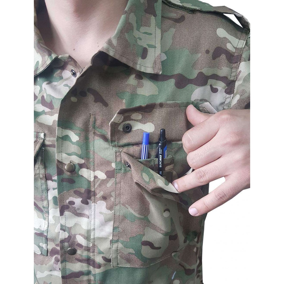- Переваги сорочки: має відкладний комір, погони на липучках, 2 нагрудних кишені, всередині яких є маленькі відділення. Застібається на кнопки.