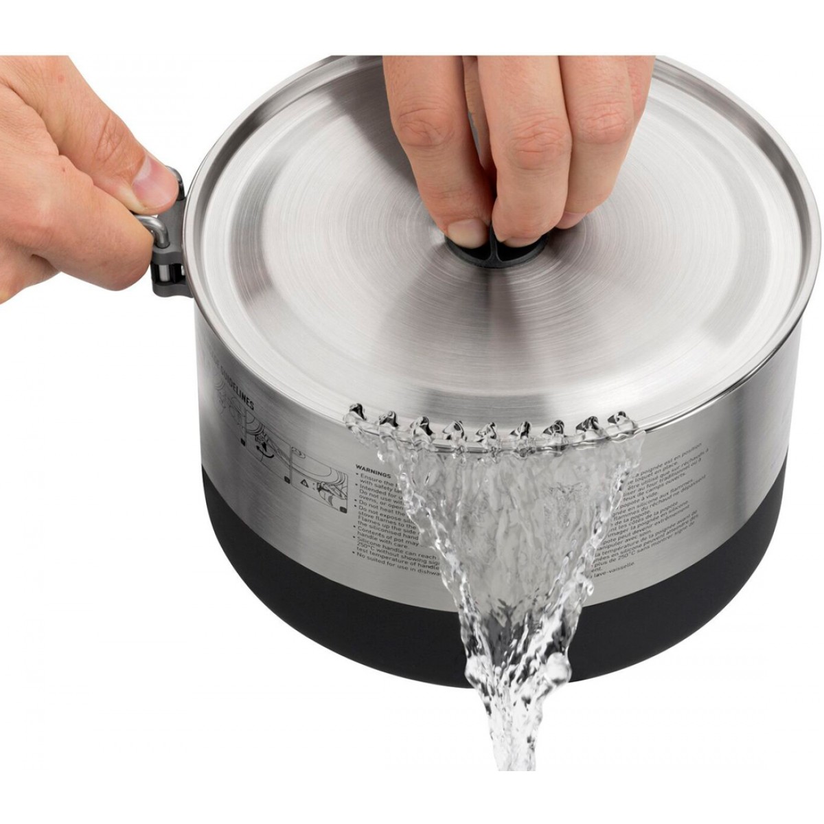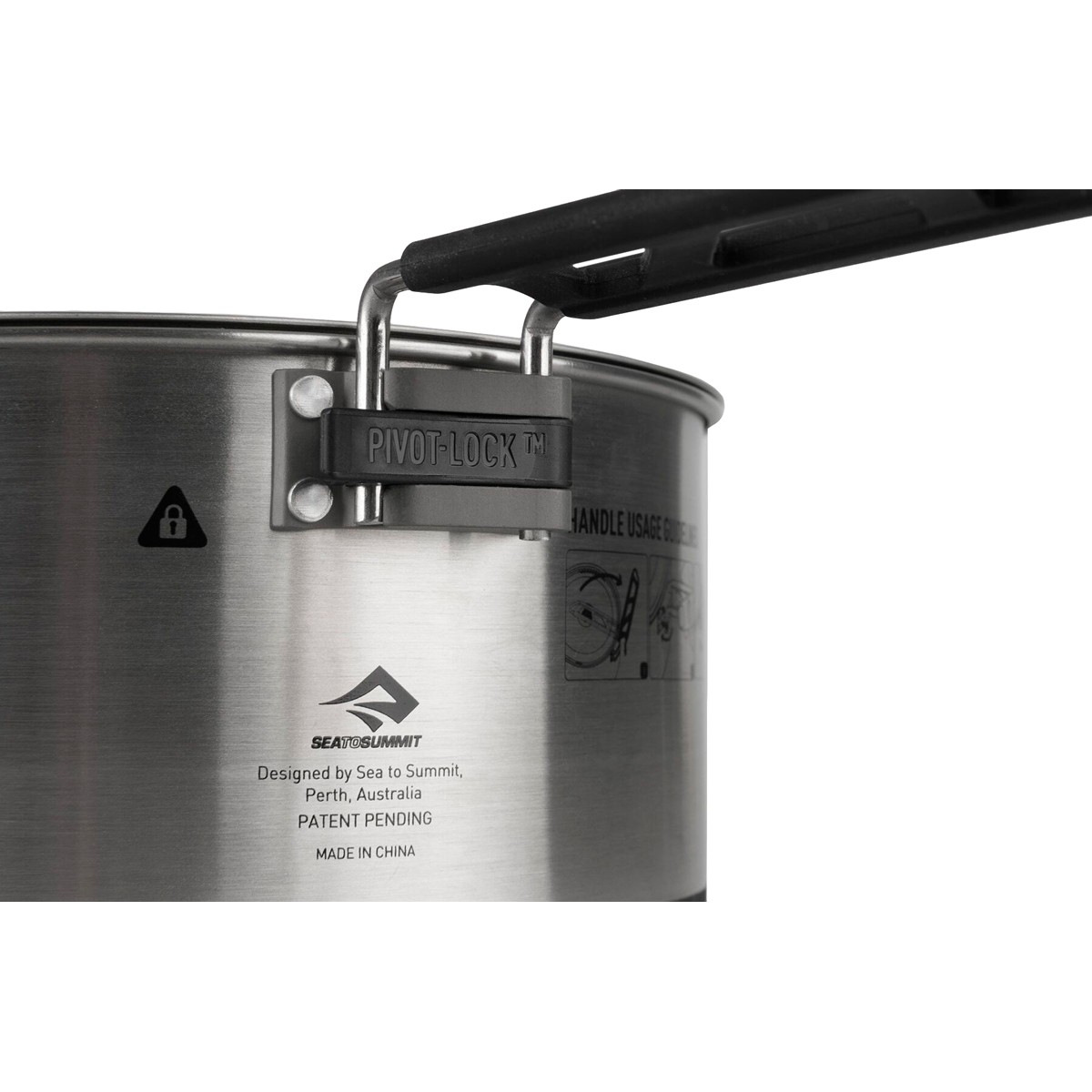 Котелок Sea To Summit Sigma Pot – розроблений спеціально для приготування їжі у польових умовах. Корпус виконаний з легкої та довговічної нержавіючої сталі, яка стійка до стирання та легко очищається. Запатентована ручка Pivot-Lock має складну конструкцію для зручності транспортування та надійно фіксується у розкладеному положенні. На внутрішній стороні каструлі нанесено мірну шкалу для контролю обсягу вмісту. Кришка має спеціальний силіконовий тримач та отвори для зручності зливу води. Австралійська компанія Sea To Summit пропонує Вашій увазі серію котелків Sigma Pot, що складається з декількох обсягів на 1.2, 1.9, 2.7 і 3.7 літра.