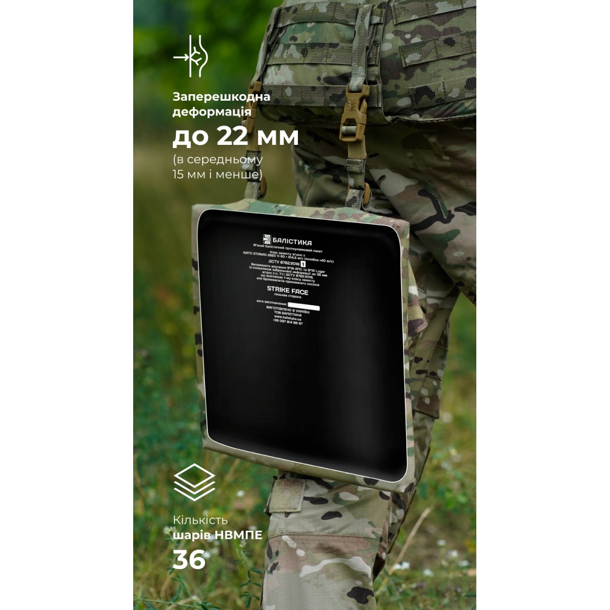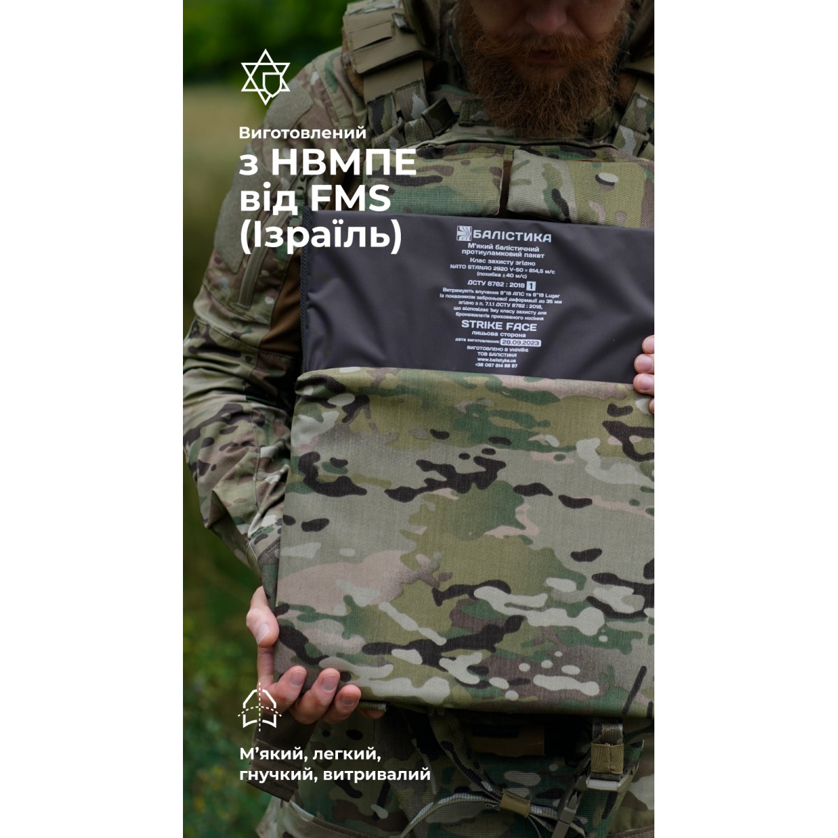 Протиуламковий бронепакет встановлюється всередину тактичного килимка й забезпечує захист сідниць та стегон. ✅ Ключові переваги Найвищі показники протиуламкової стійкості: бронепакет із 36 шарів НВМПЕ тримає уламки зі швидкістю 614,5 м/с (STANAG 2920 V50) Сировина світового рівня: НВМПЕ від FMS (Ізраїль) Зменшує заперешкодну травму: НВМПЕ від FMS має щільне перехресне накладення волокон, що зменшує вдавлення броні з внутрішнього боку Відповідає 1-му класу захисту за ДСТУ 8782:2018 Запаяний у герметичний чохол, який захищає від вологи, бруду та ультрафіолету Опис товару Наші бронепакети створено насамперед для захисту від уламків, які є найпоширенішою загрозою на фронті. Вироби мають найвищі показники протиуламкової стійкості та результати за показником V50 (STANAG 2920, ДСТУ 8782:2018) у своєму класі. Надвисокомолекулярний поліетилен (НВМПЕ), з якого вони виготовлені, є легким, гнучким і водночас дуже міцним матеріалом. Наші тактичні килимки містять по два шари піни. Один із них можна вийняти, а на його місце встановити бронепакет 1-го класу захисту. Після цього виріб стає бар’єром не лише для холодних, твердих, брудних і вогких поверхонь, а й для уламків. Бронепакет стійкий до ураження кулями калібру 9×18 мм (9 mm Makarov), 9×19 мм (9 mm Luger, 9 мм Parabellum), 9×19 (мм), що відповідає 1-му класу захисту за ДСТУ 8782:2018. Під час випробувань витримує постріл з автоматичного пістолета Стєчкіна з відстані 5 м. Захищає від дрібних уламків (осколків) та вторинних уражальних елементів – фрагментів бетону, цегли, скла, дерева тощо. Має заперешкодну деформацію до 22 мм (у середньому 15 мм і менше). Цьому сприяє щільне плетіння волокон НВМПЕ. Це критично важливо для зменшення ризику контузій без пробиття. Ультразвукова герметизація гарантує, що бронепакет не втратить властивостей під впливом поту, дощу, бруду чи прямих сонячних променів. Вивірена кількість шарів і природна гнучкість матеріалу сприяють тому, що бронепакет адаптується до форми тіла й не заважає у бою. ℹ️ Протокол відстрілу бронепакета 1-го класу захисту згідно з ДСТУ (STANAG V50 – 614,5 м/с) ℹ️ Протокол відстрілу бронепакета 1-го класу захисту згідно з ДСТУ (8782:2018 ) ❓ Часті запитання Чи можна використовувати бронепакет з іншим спорядженням? Так, якщо ваше спорядження відповідає за розмірами цьому бронепакету. Чи має цей бронепакет термін придатності? Чи втрачає характеристики з часом при зберіганні в домашніх умовах (наприклад, не під сонцем і не під дощем)? Наші бронепакети герметично запаяні. Якщо герметичність не порушена, а умови зберігання не екстремальні, бронепакет зберігає свої властивості понад 10 років. Чи є ризик проколоти килимок разом із бронепакетом, наприклад, сухими гілками або камінням? І килимок, і бронепакет виготовлені із міцних матеріалів, стійких до проколів. Проте, як і будь-яке спорядження, він не захищений від механічних пошкоджень у разі сильного точкового впливу. Ми радимо уникати вкладання килимка на гострі предмети та обирати для привалу відносно рівні ділянки.Відгуки про Балістичний пакет для тактичного килимка XL (1 клас | 39,5×29,5 см | 700 г | НВМПЕ ✡ Ізраїль) ТМ Балістика