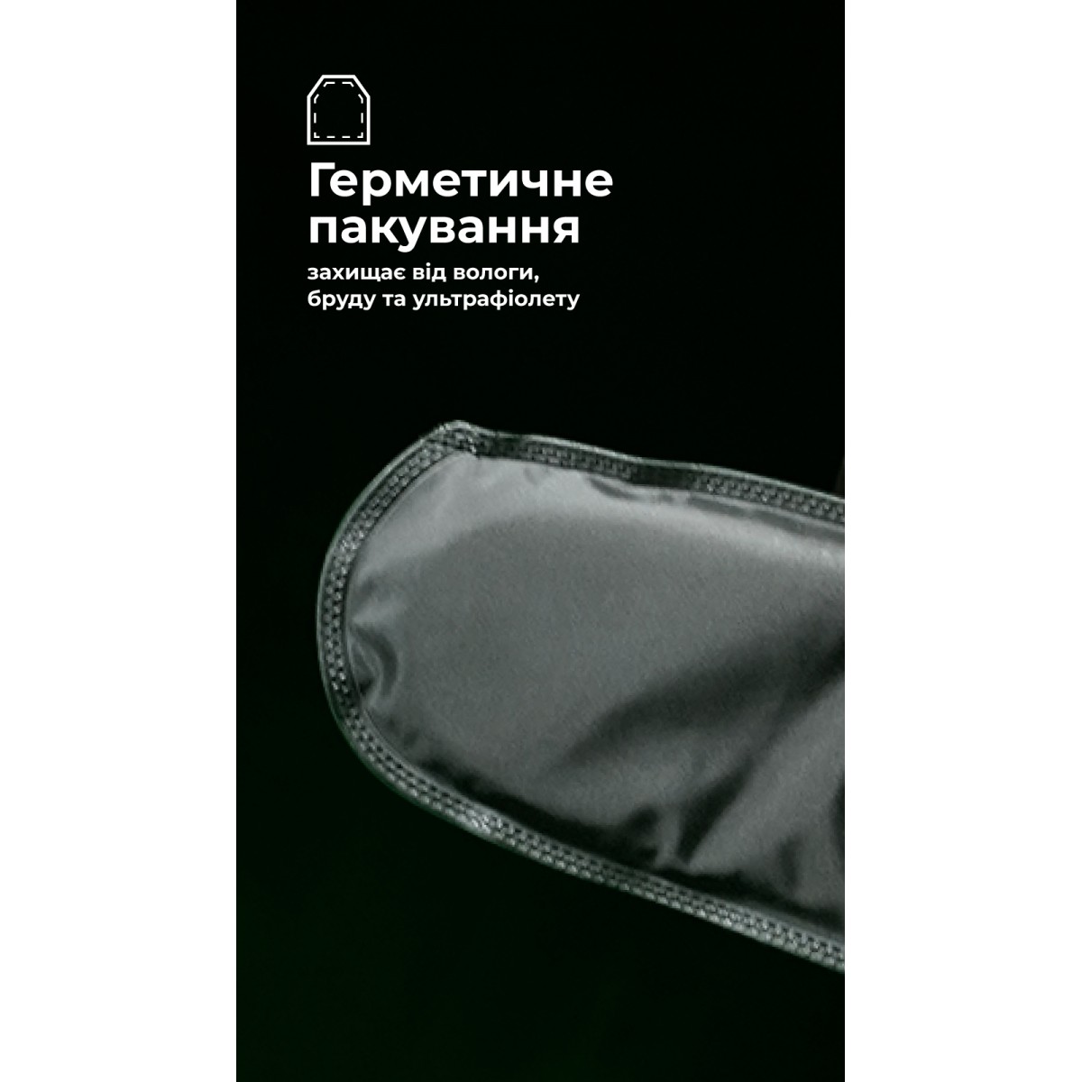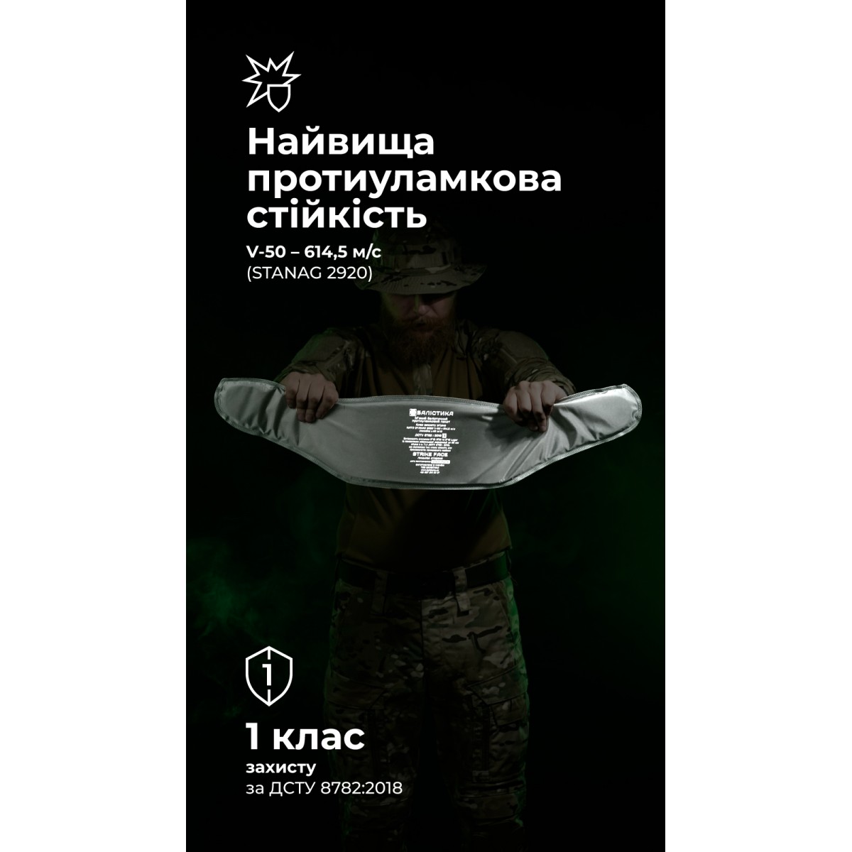Балістичний пакет 1-го класу захисту для «Черсел» Слім S розширює площу захисту спорядження на 8,6 дм² і водночас зберігає повну функціональність розвантажувальної системи. ✅ Ключові переваги Найвищі показники протиуламкової стійкості: бронепакет із 36 шарів НВМПЕ тримає уламки зі швидкістю 614,5 м/с (STANAG 2920 V50) Сировина світового рівня: НВМПЕ від FMS (Ізраїль) Зменшує заперешкодну травму: НВМПЕ від FMS має щільне перехресне накладення волокон, що зменшує вдавлення броні з внутрішнього боку Відповідає 1-му класу захисту за ДСТУ 8782:2018 Запаяний у герметичний чохол, який захищає від вологи, бруду та ультрафіолету Опис товару Наші бронепакети створено насамперед для захисту від уламків, які є найпоширенішою загрозою на фронті. Вироби мають найвищі показники протиуламкової стійкості та результати за показником V50 (STANAG 2920, ДСТУ 8782:2018) у своєму класі. Надвисокомолекулярний поліетилен (НВМПЕ), з якого вони виготовлені, є легким, гнучким і водночас дуже міцним матеріалом. Бронепакет стійкий до ураження кулями калібру 9×18 мм (9 mm Makarov), 9×19 мм (9 mm Luger, 9 мм Parabellum), 9×19 (мм), що відповідає 1-му класу захисту за ДСТУ 8782:2018. Під час випробувань витримує постріл з автоматичного пістолета Стєчкіна та пістолета Glock 17 кулею зі свинцевим осердям із відстані 10 м. Захищає від дрібних уламків (осколків) та вторинних уражальних елементів – фрагментів бетону, цегли, скла, дерева тощо. Має заперешкодну деформацію до 22 мм (у середньому 15 мм і менше). Цьому сприяє щільне плетіння волокон НВМПЕ. Це критично важливо для зменшення ризику контузій без пробиття. Ультразвукова герметизація гарантує, що бронепакет не втратить властивостей під впливом поту, дощу, бруду чи прямих сонячних променів. Вивірена кількість шарів і природна гнучкість матеріалу сприяють тому, що бронепакет адаптується до форми тіла й не заважає у бою. ℹ️ Протокол відстрілу бронепакета 1-го класу захисту згідно з ДСТУ (STANAG V50 – 614,5 м/с) ℹ️ Протокол відстрілу бронепакета 1-го класу захисту згідно з ДСТУ (8782:2018 ) ️ Конструктивні особливості ✔️ Виріб має нестандартну форму з розширенням у центрі та звуженням до кінців, яка повністю повторює вигини та контури РПС. ✔️ Підходить лише під «Черсел» і з розвантажувальними системами інших виробників не сумісний. ✔️ Покриває область талії та попереку, однак через специфіку пояса абдомінальна зона залишається майже повністю відкритою. Для неї у «Балістика» передбачені окремі модулі захисту. ✔️ Демпферні якості бронеелемента посилюються завдяки вставці з піни, якою комплектується РПС. ❓ Часті запитання Який сенс ставити бронепакет в РПС, якщо є плитоноска? Плитоноска захищає лише життєво важливі органи грудної клітки. А бронепакет в РПС покриває додаткову зону (талія, боки, поперек), яка також часто піддається уламковим пораненням. Балістичний пакет потрібно встановлювати замість тієї пінки, що йде всередині РПС, чи разом з нею, поверх? Ми радимо не виймати піну, якщо ви використовуєте цей бронепакет. Вона слугує як додатковий демпфер. Піна має розташовуватись ближче до тіла, потім бронепакет. Чи потрібно виймати бронепакет перед пранням РПС? Так, пакет не призначений для прання – він виймається через окрему застібку з велкро. Однак саму РПС також не варто прати, принаймні у пральній машинці. Достатньо протерти м’якою щіткою з використанням безфосфатного пор