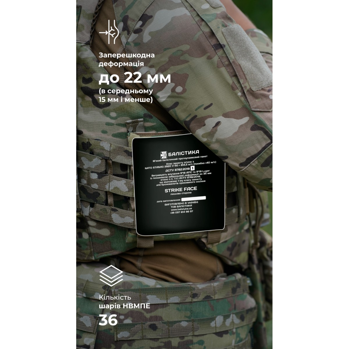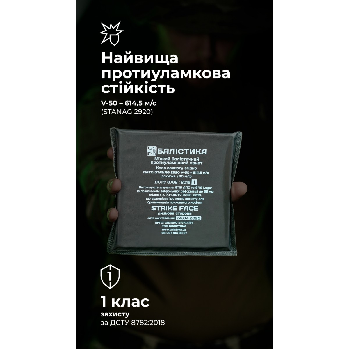 Протиуламковий бронепакет встановлюється всередину бічної кишені до камербанда і забезпечує захист м’яких тканин та внутрішніх органів у зоні боків. Підходить під бічну кишеню у розмірі 15×15 см. ℹ️ Увага! Бронепакети реалізуються поштучно, тому для повного комплекту бічного захисту вам потрібні дві штуки ✅ Ключові переваги Найвищі показники протиуламкової стійкості: бронепакет із 36 шарів НВМПЕ тримає уламки зі швидкістю 614,5 м/с (STANAG 2920 V50) Сировина світового рівня: НВМПЕ від FMS (Ізраїль) Зменшує заперешкодну травму: НВМПЕ від FMS має щільне перехресне накладення волокон, що зменшує вдавлення броні з внутрішнього боку Відповідає 1-му класу захисту за ДСТУ 8782:2018 Запаяний у герметичний чохол, який захищає від вологи, бруду та ультрафіолету Опис товару Наші бронепакети створено насамперед для захисту від уламків, які є найпоширенішою загрозою на фронті. Вироби мають найвищі показники протиуламкової стійкості та результати за показником V50 (STANAG 2920, ДСТУ 8782:2018) у своєму класі. Надвисокомолекулярний поліетилен (НВМПЕ), з якого вони виготовлені, є легким, гнучким і водночас дуже міцним матеріалом. Бронепакет стійкий до ураження кулями калібру 9×18 мм (9 mm Makarov), 9×19 мм (9 mm Luger, 9 мм Parabellum), 9×19 (мм), що відповідає 1-му класу захисту за ДСТУ 8782:2018. Під час випробувань витримує постріл з автоматичного пістолета Стєчкіна з відстані 5 м. Захищає від дрібних уламків (осколків) та вторинних уражальних елементів – фрагментів бетону, цегли, скла, дерева тощо. Має заперешкодну деформацію до 22 мм (у середньому 15 мм і менше). Цьому сприяє щільне плетіння волокон НВМПЕ. Це критично важливо для зменшення ризику контузій без пробиття. Ультразвукова герметизація гарантує, що бронепакет не втратить властивостей під впливом поту, дощу, бруду чи прямих сонячних променів. Завдяки правильній прямокутній формі легко встановлюється всередину бічної кишені. Вивірена кількість шарів і природна гнучкість матеріалу сприяють тому, що бронепакет адаптується до форми тіла й не заважає у бою. ℹ️ Протокол відстрілу бронепакета 1-го класу захисту згідно з ДСТУ (STANAG V50 – 614,5 м/с) ℹ️ Протокол відстрілу бронепакета 1-го класу захисту згідно з ДСТУ (8782:2018 )Відгуки про Балістичний пакет (1 клас | 15×15 см | 140 г | НВМПЕ ✡ Ізраїль) ТМ Балістика