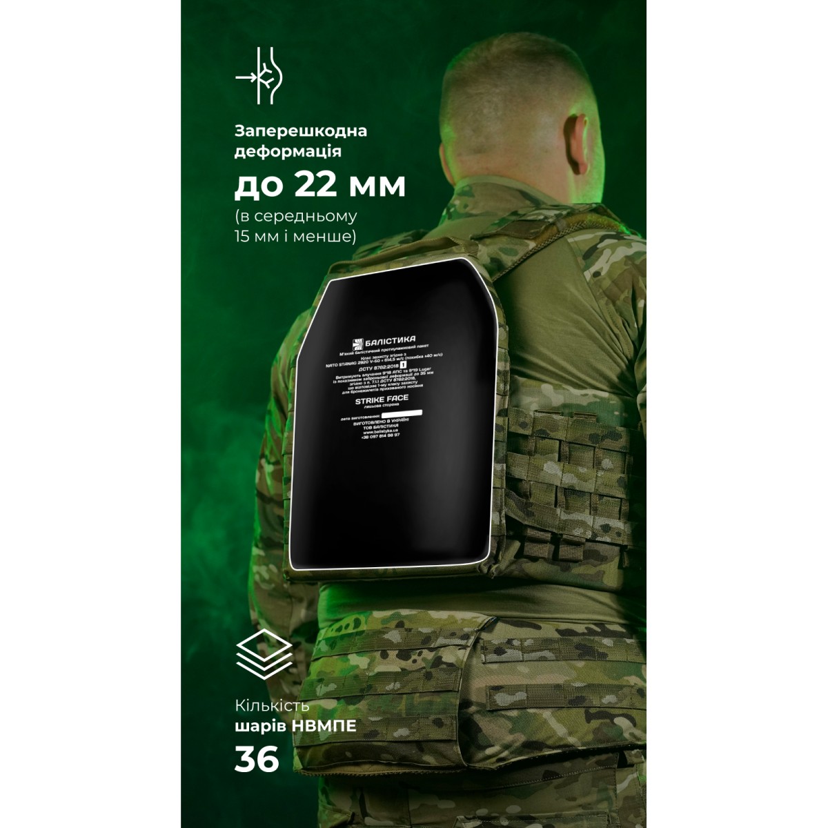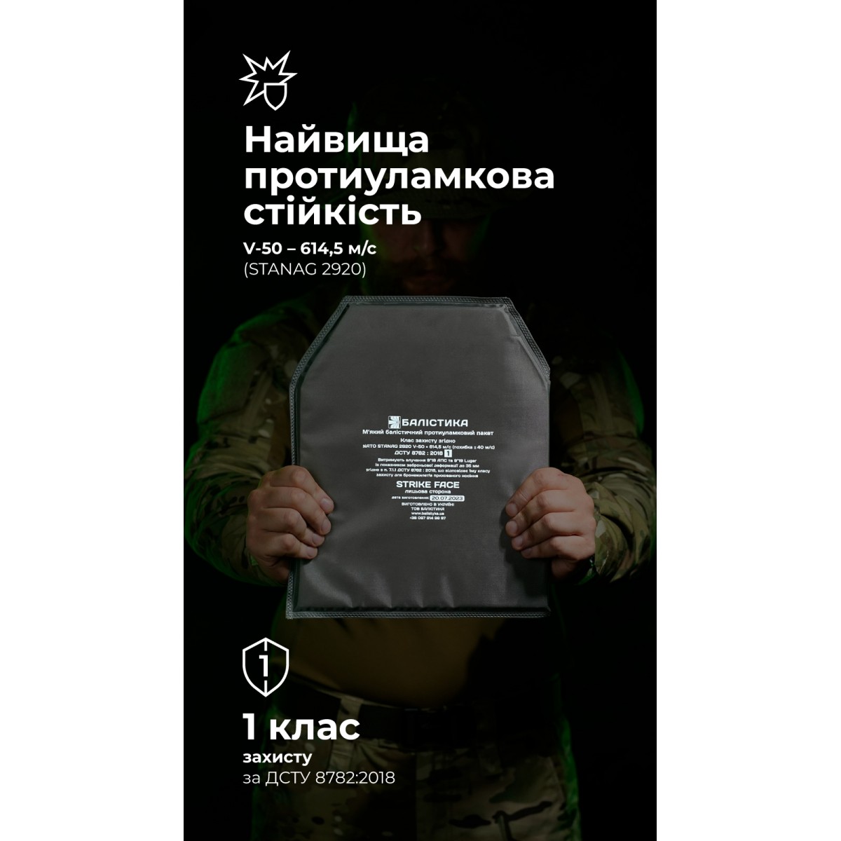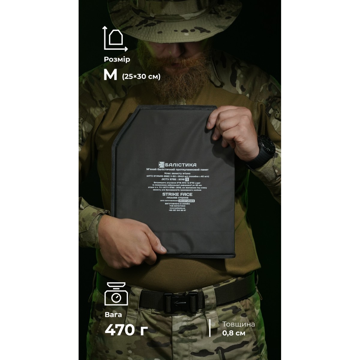 М’який балістичний підпір з НВМПЕ призначений для захисту тіла від уламків бронеплити у разі її пробиття. Також зменшує заперешкодну травму у ситуації, коли плита не пробита. ✅ Ключові переваги Найвищі показники протиуламкової стійкості: бронепакет із 36 шарів НВМПЕ тримає уламки зі швидкістю 614,5 м/с (STANAG 2920 V50) Сировина світового рівня: НВМПЕ від FMS (Ізраїль) Зменшує заперешкодну травму: НВМПЕ від FMS має щільне перехресне накладення волокон, що зменшує вдавлення броні з внутрішнього боку Відповідає 1-му класу захисту за ДСТУ 8782:2018 Запаяний у герметичний чохол, який захищає від вологи, бруду та ультрафіолету Опис товару Наші бронепакети створено насамперед для захисту від уламків, які є найпоширенішою загрозою на фронті. Вироби мають найвищі показники протиуламкової стійкості та результати за показником V50 (STANAG 2920, ДСТУ 8782:2018) у своєму класі. Надвисокомолекулярний поліетилен (НВМПЕ), з якого вони виготовлені, є легким, гнучким і водночас дуже міцним матеріалом. Основне завдання балістичного підпору з надвисокомолекулярного поліетилену – «підстрахувати» плиту формату SA (Stand Alone) від пробою. А якщо це формат ICW (In Conjunction With), то використання підпору взагалі обов’язкове. Підпір стійкий до ураження кулями калібру 9×18 мм (9 mm Makarov), 9×19 мм (9 mm Luger, 9 мм Parabellum), 9×19 (мм), що відповідає 1-му класу захисту за ДСТУ 8782:2018. Під час випробувань витримує постріл з автоматичного пістолета Стєчкіна з відстані 5 м. ℹ️ Протокол відстрілу бронепакета 1-го класу захисту згідно з ДСТУ (STANAG V50 – 614,5 м/с) ℹ️ Протокол відстрілу бронепакета 1-го класу захисту згідно з ДСТУ (8782:2018 ) Захищає від дрібних уламків (осколків) та вторинних уражальних елементів – фрагментів бетону, цегли, скла, дерева тощо. Мають заперешкодну деформацію до 22 мм (у середньому 15 мм і менше). Цьому сприяє щільне плетіння волокон НВМПЕ. Це критично важливо для зменшення ризику контузій без пробиття. Покращує захисні властивості бронеплити. Але підвищення класу не є прямим, тобто якщо до плити 3-го класу захисту додати м’який балістичний підпір 1-го класу захисту, у сумі це не дасть 4-й клас захисту. Ультразвукова герметизація гарантує, що бронепакет не втратить властивостей під впливом поту, дощу, бруду чи прямих сонячних променів. Вивірена кількість шарів і природна гнучкість матеріалу сприяють тому, що бронепакет адаптується до форми тіла й не заважає у бою. ℹ️ Підпори з НВМПЕ актуальні для будь-яких бронеплит, адже можуть зупинити їхні фрагментовані уламки. Наприклад, вони показали ефективність під час тестового відстрілу сталевої бронеплити 4-го класу захисту. Для цього була використана куля Б32 для боєприпасу калібру 7,62×54 та БЗ для калібру 7,62×39, які пробивають четвертий клас. І хоч виявилося, що плита пробита, але уламки кулі та самої плити зупинились у підпорі з НВМПЕ. Дослідний манекен отримав потужний удар, але завдяки демпферу залишився «живим». ❓ Часті запитання Чи підвищує підпір клас захисту бронеплити? Ні. Підпір покращує загальну ефективність плити, але не підвищує її клас офіційно. Наприклад, комбінація бронеплити 3-го класу й підпору 1-го класу не означає 4-й клас захисту. Але це не стосується нашої бронепластини 3+ класу захисту (4-й клас з балістичним підпором) 25 × 30 , яка відстрілювалася з підпором, і разом вони мають підтверджений 4-й клас захисту. Чи потрібен підпір до металевої плити