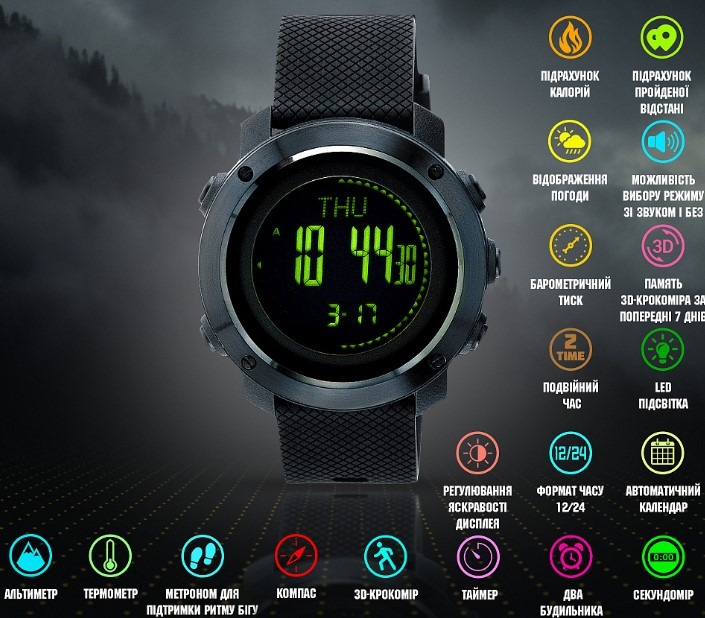 Ідеальний годинник для найскладніших умов експлуатації. Модель Skmei Processor з компасом пропонує широкий набір функцій, зокрема барометр, термометр, крокомір та ін. Виготовляється з міцного полікарбонату із кварцовим механізмом. Сполучається з девайсами на ОС Android та iOS.