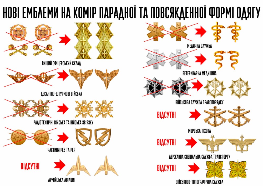 - Емблеми: нашиваються на комірі форми або на грудях. Їх розташування регулюється специфічними вимогами для кожного роду військ.