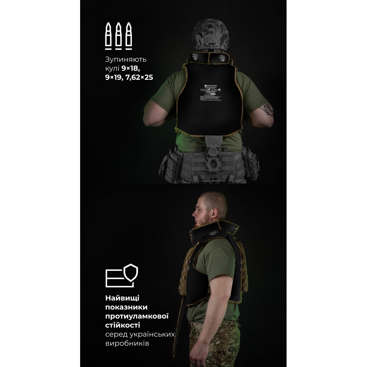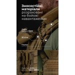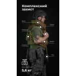 Бронежилет «Сармат» оснащений м’якими бронепакетами 2-го класу захисту згідно з ДСТУ 8782:2018. Вони виготовлені з якісного ізраїльського НВМПЕ, який вирізняється малою вагою та ефективно зупиняє уламки. М’який бронезахист у нашому виробі покриває не лише груди та спину, а й шию, ключиці, живіт і пах. Рухомий фартух та від’єднуваний комір дозволяють налаштувати бронежилет відповідно до завдання та суттєво збільшують площу захисту. Ключові переваги бронежилета Високий рівень захисту одразу Бронежилет комплектується балістичними пакетами 2-го класу з НВМПЕ від FMS. Завдяки цьому значно зменшується ризик пробиття та мінімізуються заперешкодні травми. Крім того, наші бронепакети мають найвищі показники протиуламкової стійкості серед інших виробників. Велика площа захисту – 49,28 дм2 У конструкції передбачено розширене покриття життєво важливих зон – шиї, ключиць, живота та паху – вже в базовій комплектації. Оновлений модуль захисту шиї Порівняно з попередньою версією нова забезпечує кращий комфорт. Розріз на задній частині розходиться під тиском шолома, що сприяє вільному руху голови. Водночас шолом менше зсувається вперед і не наїжджає на лоб і очі. Краї розрізу накладаються один на одного, тож у звичайному положенні між ними немає щілини, у яку може влучити уламок. Крім того, зсередини бортики обшиті м’яким велкро і не натирають шкіру. Система екстреного скидання Система дозволяє за секунду розділити бронежилет на передню і задню частини. Механізм складається зі сталевих тросів, протягнутих крізь жолобки по периметру передньої кишені під плиту. Він активується двома прихованими хлястиками. Також передбачена можливість скидання на один чи другий бік. Матеріали, розраховані на максимальну витривалість У виробництві використані міцні зносостійкі матеріали – нейлон 1000D (аналог Cordura), гіполон, 3D-сітка – та перевірена фурнітура (AMM), які витримують інтенсивну експлуатацію в умовах бойових дій. Це гарантує довговічність, надійність, стійкість до вологи, пилу та механічних впливів. Особливості товару Балістичний захист Бронежилет оснащений м’яким бронезахистом 2-го класу захисту загальною площею 49,28 дм2 та вагою 5,6 кг (без бронеплит). Матеріал для бронепакетів – надвисокомолекулярний поліетилен (НВМПЕ) – виробляється ізраїльською компанією FMS. Показник їхньої протиуламкової стійкості (V-50) становить 758,6 м/с. Витримують постріл 9×18 мм (9 mm Makarov), 9×19 мм (9 mm Luger, 9 mm Parabellum) із пістолетів та карабінів у пістолетному патроні та 7,62×25 мм (7,62×25 Tokarev). Протокол відстрілу 2-й клас захисту згідно з ДСТУ (STANAG V-50 – 758,6 м/с). Протокол відстрілу «Сармат» 2-й клас згідно з ДСТУ. Бронеплити Окрім відсіків для м’яких бронепакетів, «Сармат» оснащений фронтальною та тильною кишенями для бронеплит. Вони розраховані на комплектацію стандартними пластинами розміром 25×30 см зі скошеними верхніми кутами товщиною до 3 см. Також сумісні з пластинами SAPI M та ESAPI M. Бронежилет сумісний з усіма бронеплитами розміром 25×30, які можна придбати в магазинах «Балістика»: Анатомічна поліетиленова бронеплита з демпфером (3 клас захисту | 1.6 кг | 25х30 см | НВМПЕ). Бронепластина 6-го класу захисту керамічна. Матеріали Бронежилет виготовлений з міцного, зносостійкого нейлону, що здатен витримувати значні навантаження впродовж тривалого часу. Вся внутрішня частина вистелена 3D-сіткою, 