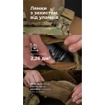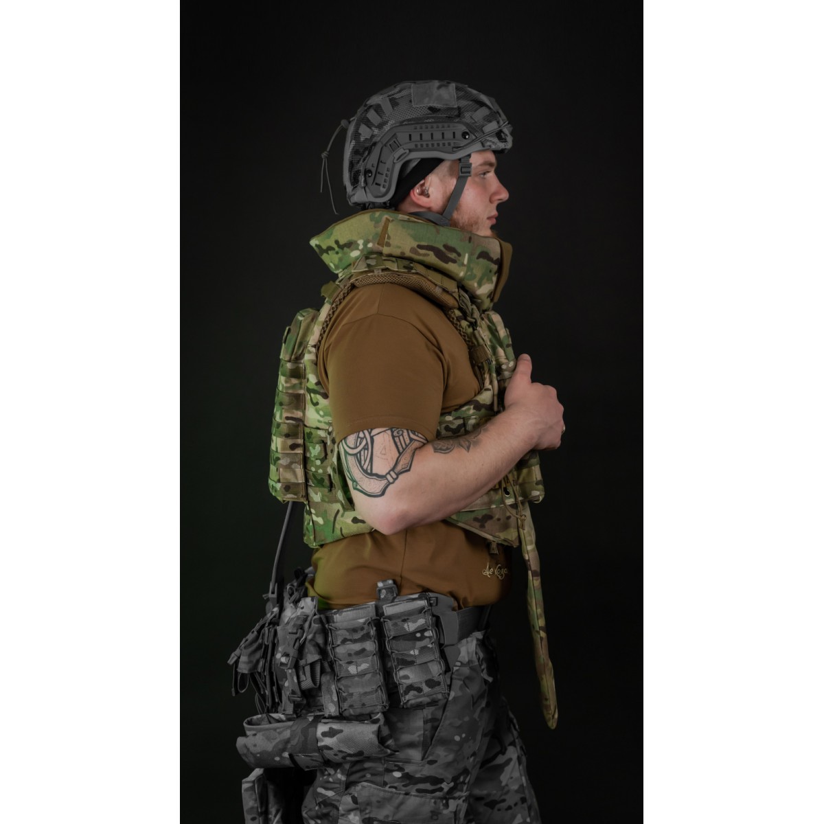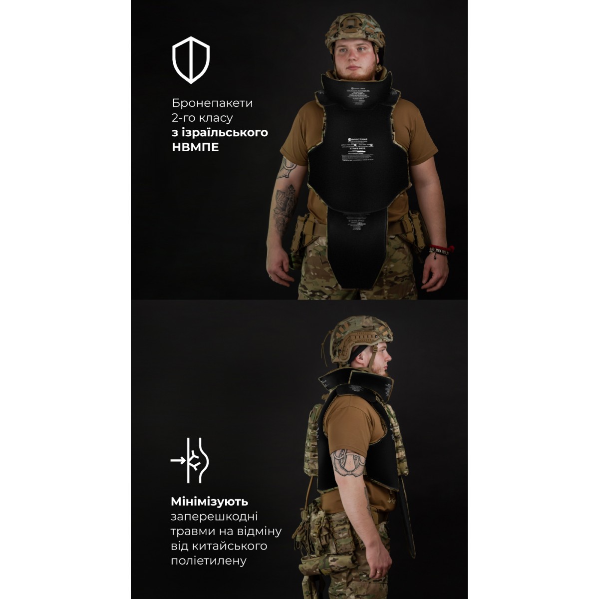 Бронежилет «Сармат» оснащений м’якими бронепакетами 2-го класу захисту згідно з ДСТУ 8782:2018. Вони виготовлені з якісного ізраїльського НВМПЕ, який вирізняється малою вагою та ефективно зупиняє уламки. М’який бронезахист у нашому виробі покриває не лише груди та спину, а й шию, ключиці, живіт і пах. Рухомий фартух та від’єднуваний комір дозволяють налаштувати бронежилет відповідно до завдання та суттєво збільшують площу захисту. Ключові переваги бронежилета Високий рівень захисту одразу Бронежилет комплектується балістичними пакетами 2-го класу з НВМПЕ від FMS. Завдяки цьому значно зменшується ризик пробиття та мінімізуються заперешкодні травми. Крім того, наші бронепакети мають найвищі показники протиуламкової стійкості серед інших виробників. Велика площа захисту – 49,28 дм2 У конструкції передбачено розширене покриття життєво важливих зон – шиї, ключиць, живота та паху – вже в базовій комплектації. Оновлений модуль захисту шиї Порівняно з попередньою версією нова забезпечує кращий комфорт. Розріз на задній частині розходиться під тиском шолома, що сприяє вільному руху голови. Водночас шолом менше зсувається вперед і не наїжджає на лоб і очі. Краї розрізу накладаються один на одного, тож у звичайному положенні між ними немає щілини, у яку може влучити уламок. Крім того, зсередини бортики обшиті м’яким велкро і не натирають шкіру. Система екстреного скидання Система дозволяє за секунду розділити бронежилет на передню і задню частини. Механізм складається зі сталевих тросів, протягнутих крізь жолобки по периметру передньої кишені під плиту. Він активується двома прихованими хлястиками. Також передбачена можливість скидання на один чи другий бік. Матеріали, розраховані на максимальну витривалість У виробництві використані міцні зносостійкі матеріали – нейлон (Cordura 1000D), гіполон, 3D-сітка – та перевірена фурнітура (AMM), які витримують інтенсивну експлуатацію в умовах бойових дій. Це гарантує довговічність, надійність, стійкість до вологи, пилу та механічних впливів. Особливості товару Балістичний захист Бронежилет оснащений м’яким бронезахистом 2-го класу захисту загальною площею 49,28 дм2 та вагою 5,6 кг (без бронеплит). Матеріал для бронепакетів – надвисокомолекулярний поліетилен (НВМПЕ) – виробляється ізраїльською компанією FMS. Показник їхньої протиуламкової стійкості (V-50) становить 758,6 м/с. Витримують постріл 9×18 мм (9 mm Makarov), 9×19 мм (9 mm Luger, 9 mm Parabellum) із пістолетів та карабінів у пістолетному патроні та 7,62×25 мм (7,62×25 Tokarev). Протокол відстрілу 2-й клас захисту згідно з ДСТУ (STANAG V-50 – 758,6 м/с). Протокол відстрілу «Сармат» 2-й клас згідно з ДСТУ. Бронеплити Окрім відсіків для м’яких бронепакетів, «Сармат» оснащений фронтальною та тильною кишенями для бронеплит. Вони розраховані на комплектацію стандартними пластинами розміром 25×30 см зі скошеними верхніми кутами товщиною до 3 см. Також сумісні з пластинами SAPI M та ESAPI M. Бронежилет сумісний з усіма бронеплитами розміром 25×30, які можна придбати в магазинах «Балістика»: Анатомічна поліетиленова бронеплита з демпфером (3 клас захисту | 1.6 кг | 25х30 см | НВМПЕ). Бронепластина 6-го класу захисту керамічна. Матеріали Бронежилет виготовлений з міцного, зносостійкого нейлону, що здатен витримувати значні навантаження впродовж тривалого часу. Вся внутрішня частина вистелена 3D-сіткою, яка спр
