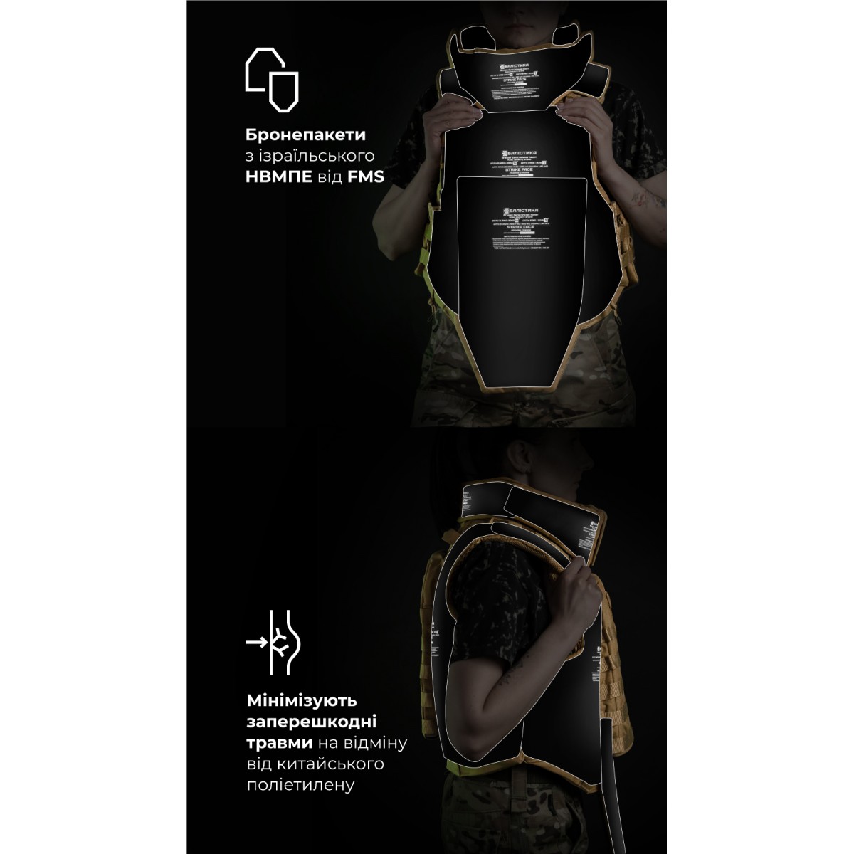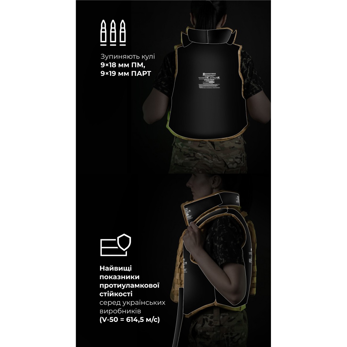 Жіночий бронежилет «Сармат» розроблений з урахуванням анатомічних особливостей жіночого тіла. Фігурні демпфери забезпечують комфортне прилягання та підтримку грудей. Виріб має м’які бронепакети 1-го класу захисту, які покривають грудну клітку, спину, шию, ключиці, живіт і пах. ✅ Ключові переваги Анатомічні демпфери та укорочені лямки забезпечують щільну, але не обмежувальну посадку, яка не здавлює груди й не заважає рухам. Наші бронепакети 1-го класу виготовлені з НВМПЕ від FMS (Ізраїль). Вони вирізняються найвищими показниками протиуламкової стійкості серед інших виробників. Площа захисту 49,34 дм² з розширеним покриттям шиї, ключиць, живота та паху вже в базовій комплектації. Зручний модуль захисту шиї з розрізом ззаду, що дозволяє рухати головою в шоломі; без щілин для уламків. М’яка велкро-накладка на переді шиї, яка запобігає подразненню шкіри на підборідді і яку можна знімати для прання. Система екстреного скидання дозволяє за секунду розділити бронежилет на передню і задню частини. Міцні матеріали – нейлон 1000D (аналог Cordura), гіполон, 3D-сітка – і надійна фурнітура AMM забезпечують довговічність і витривалість. Особливості товару ️ Балістичний захист Бронежилет оснащений м’яким бронезахистом 1-го класу загальною площею 49,34 дм² та вагою 4,8 кг (без бронеплит). Матеріал – ізраїльський НВМПЕ від компанії FMS. Показник протиуламкової стійкості (V-50) становить 614,5 м/с. Витримує постріл пістолетними кулями 9×18 мм ПМ, 9×19 мм ПАРТ. Протокол відстрілу 1-й клас захисту згідно з ДСТУ (STANAG V-50 – 614,5 м/с) Протокол відстрілу жіночого бронежилета «Сармат» 1-й клас згідно з ДСТУ ️ Бронеплити «Сармат» розрахований на комплектацію стандартними пластинами розміром 25×30 см товщиною до 3 см. Також сумісний з пластинами ESAPI M та SAPI M. Бронежилет сумісний з відповідними бронеплитами, які можна придбати в магазинах «Балістика»: Анатомічна поліетиленова бронеплита з демпфером (3 клас захисту | 1.6 кг | 25х30 см | НВМПЕ) Бронепластина 6-го класу захисту керамічна ️ Матеріали Міцний, зносостійкий нейлон, що здатен витримувати значні навантаження впродовж тривалого часу. 3D-сітка на внутрішній частині, яка сприяє циркуляції повітря і запобігає перегріванню. Анатомічні демпфери з піни зсередини передньої панелі, які зменшують тиск на груди, краще розподіляють вагу та значно знижують втому під час тривалого носіння. Нейлонова липучка велкро виробництва Alfatex. Гіполон, з якого виконана передня частина лямок і вставка на клапані лямок для вкладки приклада. ️ Лямки Бронепакети в лямках захищають від осколків плечі і ключиці. 3D-сітка та демпфер сприяють рівномірному розподілу ваги на плечах. Гіполонова частина вкорочена (порівняно з чоловічим «Сарматом»), фіксується у клапані на липучку і регулюється за довжиною відповідно до зросту військової. Зверху на лямках вміщено кілька чарунок моллі для закріплення невеликих підсумків (під турнікет чи рацію) або лямок перекидного штурмового рюкзака. Велкро-хлястики, заховані у клапанах лямок, можна вивести назовні у вигляді петель для фіксації, наприклад шланга від гідратора або антени радіостанції. ️ Модуль захисту шиї Знімний комір для захисту шиї і ключиць кріпиться до бронежилета за допомогою велкро і кнопок. Передню частину можна знімати повністю або відстібати краї та фіксувати їх липучкою. Розріз ззаду призначений дл