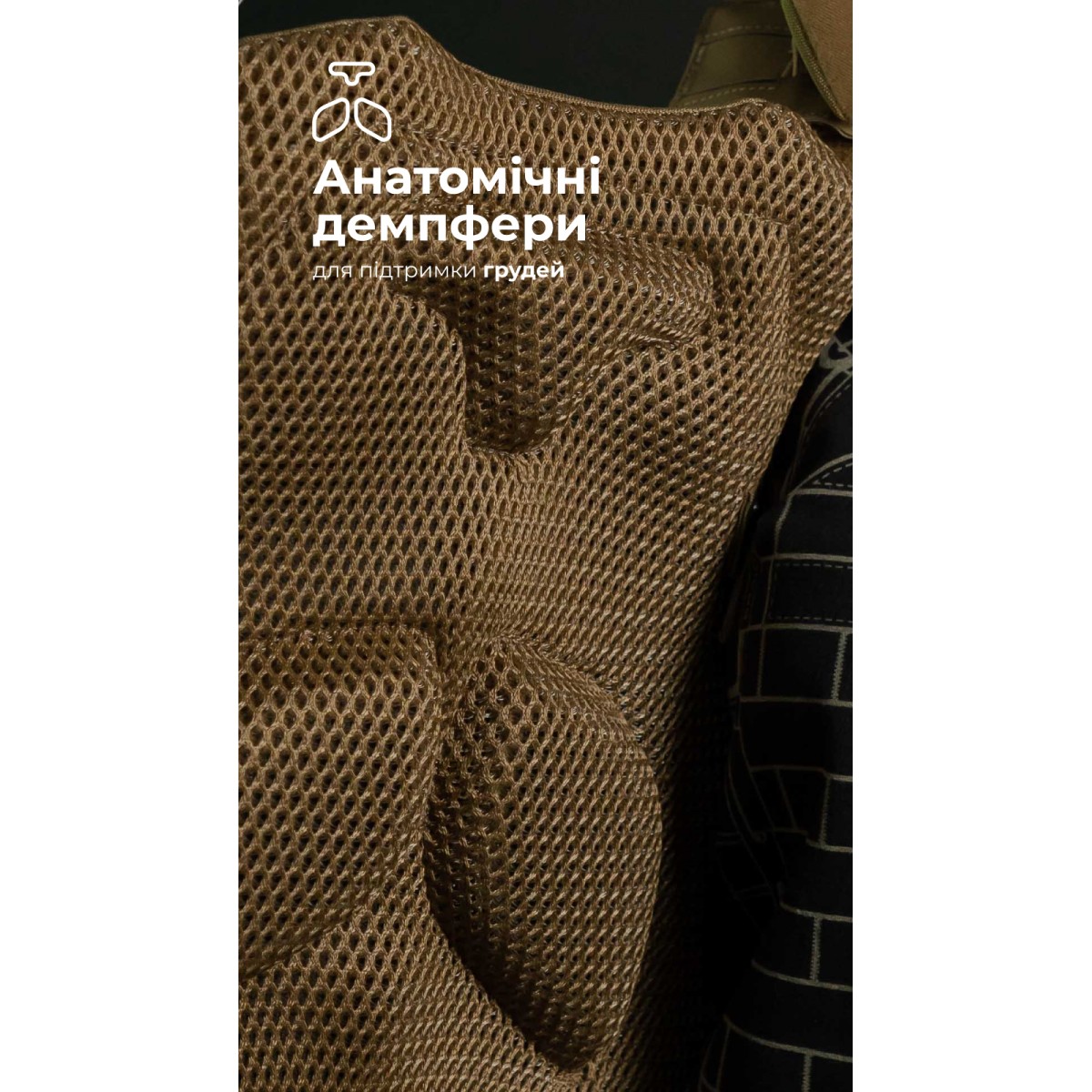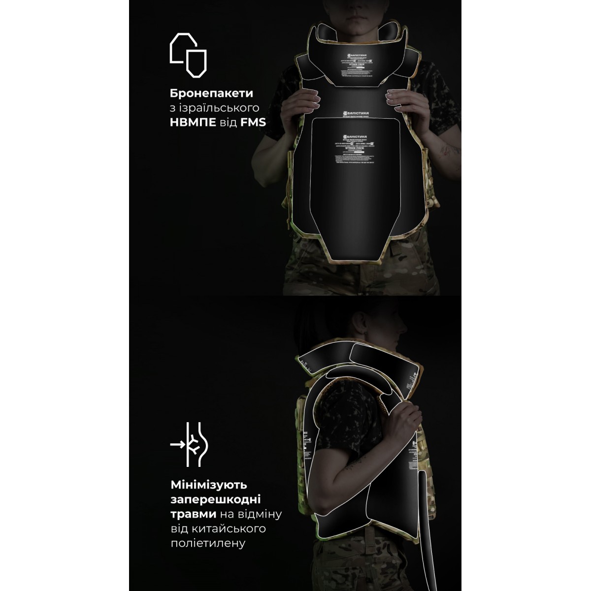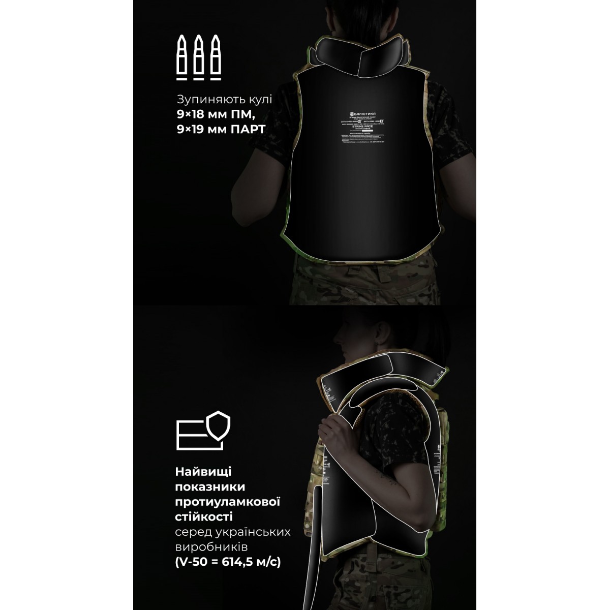 Жіночий бронежилет «Сармат» розроблений з урахуванням анатомічних особливостей жіночого тіла. Фігурні демпфери забезпечують комфортне прилягання та підтримку грудей. Виріб має м’які бронепакети 1-го класу захисту, які покривають грудну клітку, спину, шию, ключиці, живіт і пах. ✅ Ключові переваги Анатомічні демпфери та укорочені лямки забезпечують щільну, але не обмежувальну посадку, яка не здавлює груди й не заважає рухам. Наші бронепакети 1-го класу виготовлені з НВМПЕ від FMS (Ізраїль). Вони вирізняються найвищими показниками протиуламкової стійкості серед інших виробників. Площа захисту 49,34 дм² з розширеним покриттям шиї, ключиць, живота та паху вже в базовій комплектації. Зручний модуль захисту шиї з розрізом ззаду, що дозволяє рухати головою в шоломі; без щілин для уламків. М’яка велкро-накладка на переді шиї, яка запобігає подразненню шкіри на підборідді і яку можна знімати для прання. Система екстреного скидання дозволяє за секунду розділити бронежилет на передню і задню частини. Міцні матеріали – Cordura 1000D, гіполон, 3D-сітка – і надійна фурнітура AMM забезпечують довговічність і витривалість. Особливості товару ️ Балістичний захист Бронежилет оснащений м’яким бронезахистом 1-го класу загальною площею 49,34 дм² та вагою 4,8 кг (без бронеплит). Матеріал – ізраїльський НВМПЕ від компанії FMS. Показник протиуламкової стійкості (V-50) становить 614,5 м/с. Витримує постріл пістолетними кулями 9×18 мм ПМ, 9×19 мм ПАРТ. Протокол відстрілу 1-й клас захисту згідно з ДСТУ (STANAG V-50 – 614,5 м/с) Протокол відстрілу жіночого бронежилета «Сармат» 1-й клас згідно з ДСТУ ️ Бронеплити «Сармат» розрахований на комплектацію стандартними пластинами розміром 25×30 см товщиною до 3 см. Також сумісний з пластинами ESAPI M та SAPI M. Бронежилет сумісний з відповідними бронеплитами, які можна придбати в магазинах «Балістика»: Анатомічна поліетиленова бронеплита з демпфером (3 клас захисту | 1.6 кг | 25х30 см | НВМПЕ) Бронепластина 6-го класу захисту керамічна ️ Матеріали Міцний, зносостійкий нейлон, що здатен витримувати значні навантаження впродовж тривалого часу. 3D-сітка на внутрішній частині, яка сприяє циркуляції повітря і запобігає перегріванню. Анатомічні демпфери з піни зсередини передньої панелі, які зменшують тиск на груди, краще розподіляють вагу та значно знижують втому під час тривалого носіння. Нейлонова липучка велкро виробництва Alfatex. Гіполон, з якого виконана передня частина лямок і вставка на клапані лямок для вкладки приклада. ️ Лямки Бронепакети в лямках захищають від осколків плечі і ключиці. 3D-сітка та демпфер сприяють рівномірному розподілу ваги на плечах. Гіполонова частина вкорочена (порівняно з чоловічим «Сарматом»), фіксується у клапані на липучку і регулюється за довжиною відповідно до зросту військової. Зверху на лямках вміщено кілька чарунок моллі для закріплення невеликих підсумків (під турнікет чи рацію) або лямок перекидного штурмового рюкзака. Велкро-хлястики, заховані у клапанах лямок, можна вивести назовні у вигляді петель для фіксації, наприклад шланга від гідратора або антени радіостанції. ️ Модуль захисту шиї Знімний комір для захисту шиї і ключиць кріпиться до бронежилета за допомогою велкро і кнопок. Передню частину можна знімати повністю або відстібати краї та фіксувати їх липучкою. Розріз ззаду призначений для руху головою 