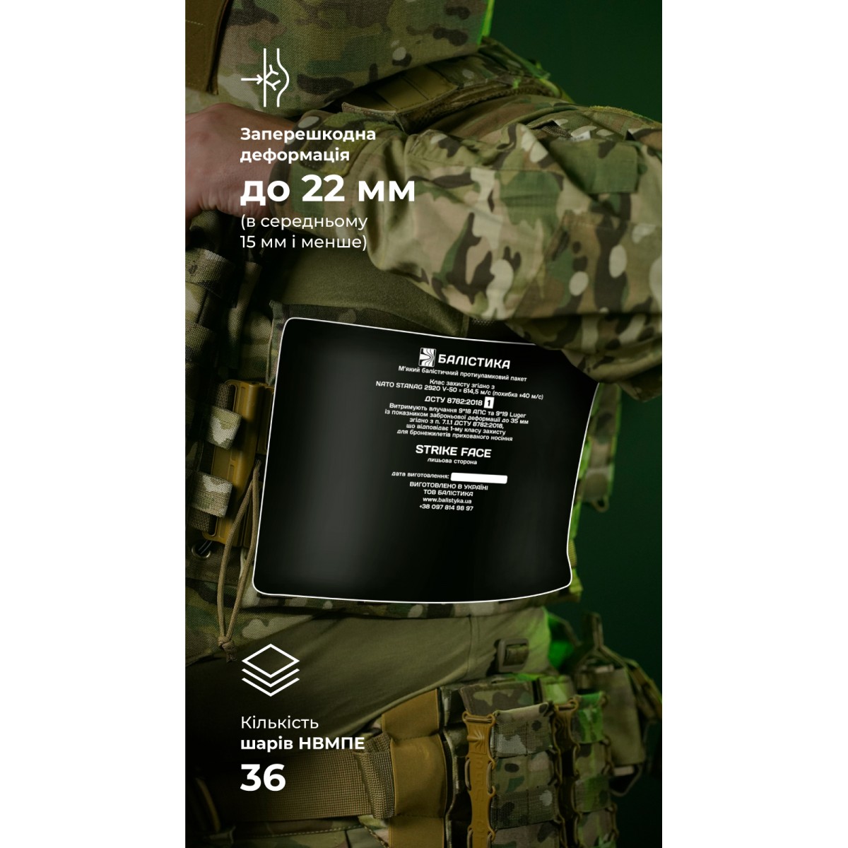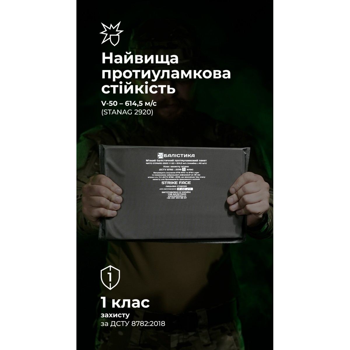 Протиуламковий бронепакет встановлюється всередину бічної кишені до камербанда і забезпечує захист м’яких тканин та внутрішніх органів у зоні боків. Підходить під бічну кишеню у розмірі 20×30 см. ℹ️ Увага! Бронепакети реалізуються поштучно, тому для повного комплекту бічного захисту вам потрібні дві штуки ✅ Ключові переваги Найвищі показники протиуламкової стійкості: бронепакет із 36 шарів НВМПЕ тримає уламки зі швидкістю 614,5 м/с (STANAG 2920 V50) Сировина світового рівня: НВМПЕ від FMS (Ізраїль) Зменшує заперешкодну травму: НВМПЕ від FMS має щільне перехресне накладення волокон, що зменшує вдавлення броні з внутрішнього боку Відповідає 1-му класу захисту за ДСТУ 8782:2018 Запаяний у герметичний чохол, який захищає від вологи, бруду та ультрафіолету Опис товару Наші бронепакети створено насамперед для захисту від уламків, які є найпоширенішою загрозою на фронті. Вироби мають найвищі показники протиуламкової стійкості та результати за показником V50 (STANAG 2920, ДСТУ 8782:2018) у своєму класі. Надвисокомолекулярний поліетилен (НВМПЕ), з якого вони виготовлені, є легким, гнучким і водночас дуже міцним матеріалом. Бронепакет стійкий до ураження кулями калібру 9×18 мм (9 mm Makarov), 9×19 мм (9 mm Luger, 9 мм Parabellum), 9×19 (мм), що відповідає 1-му класу захисту за ДСТУ 8782:2018. Під час випробувань витримує постріл з автоматичного пістолета Стєчкіна з відстані 5 м. Захищає від дрібних уламків (осколків) та вторинних уражальних елементів – фрагментів бетону, цегли, скла, дерева тощо. Має заперешкодну деформацію до 22 мм (у середньому 15 мм і менше). Цьому сприяє щільне плетіння волокон НВМПЕ. Це критично важливо для зменшення ризику контузій без пробиття. Ультразвукова герметизація гарантує, що бронепакет не втратить властивостей під впливом поту, дощу, бруду чи прямих сонячних променів. Завдяки правильній прямокутній формі легко встановлюється всередину бічної кишені. Вивірена кількість шарів і природна гнучкість матеріалу сприяють тому, що бронепакет адаптується до форми тіла й не заважає у бою. ℹ️ Протокол відстрілу бронепакета 1-го класу захисту згідно з ДСТУ (STANAG V50 – 614,5 м/с) ℹ️ Протокол відстрілу бронепакета 1-го класу захисту згідно з ДСТУ (8782:2018 ) ❓ Часті запитання Чи можна використовувати бронепакет з іншими підсумками? Так, якщо вони відповідають за розмірами цьому бронепакету. Чи має цей бронепакет термін придатності? Чи втрачає характеристики з часом при зберіганні в домашніх умовах (наприклад, не під сонцем і не під дощем)? Наші бронепакети герметично запаяні. Якщо герметичність не порушена, а умови зберігання не екстремальні, бронепакет зберігає свої властивості понад 10 років. Чи можна далі використовувати балістичний пакет, якщо була порушена герметизація пакування? Це вкрай небажано. Якщо вода потрапить між шарів поліетилену, виріб може втратити свої захисні властивості. Внаслідок гідроудару вода розсуває волокна, таким чином, збільшується заперешкодна травма і навіть виникає ризик пробиття. Тому перевіряйте герметичність пакування бронепакета. У разі його пошкодження ви можете відправити бронепакет нам – і ми безкоштовно відновимо герметичність пакування. Чи можна далі використовувати балістичний пакет, якщо він був уражений? «Балістика» не рекомендує використовувати балістичний пакет у разі ураження. Це зменшує ефективну площу захисту та збільшує йм