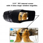 Бінокль NightVision відрізняється міцною та ергономічною конструкцією. Він виконаний із високоякісного ABS-пластику, який може витримати випадкові удари. Гумові вставки допомагають міцно утримувати бінокль. У верхній частині пристрою розташовані кнопки керування. Отримана картинка виводиться на екран діагоналлю 2,31″, який дозволяє добре розглянути деталі зображення. До додаткових переваг екрану відносяться лінза, що збільшує, і гумова окантовка. На екрані відображається режим зйомки та індикатор заряду батареї. Також Ви можете відрегулювати оптичне підстроювання, налаштувавши різкість деталей для більш чіткого та інформативного зображення.