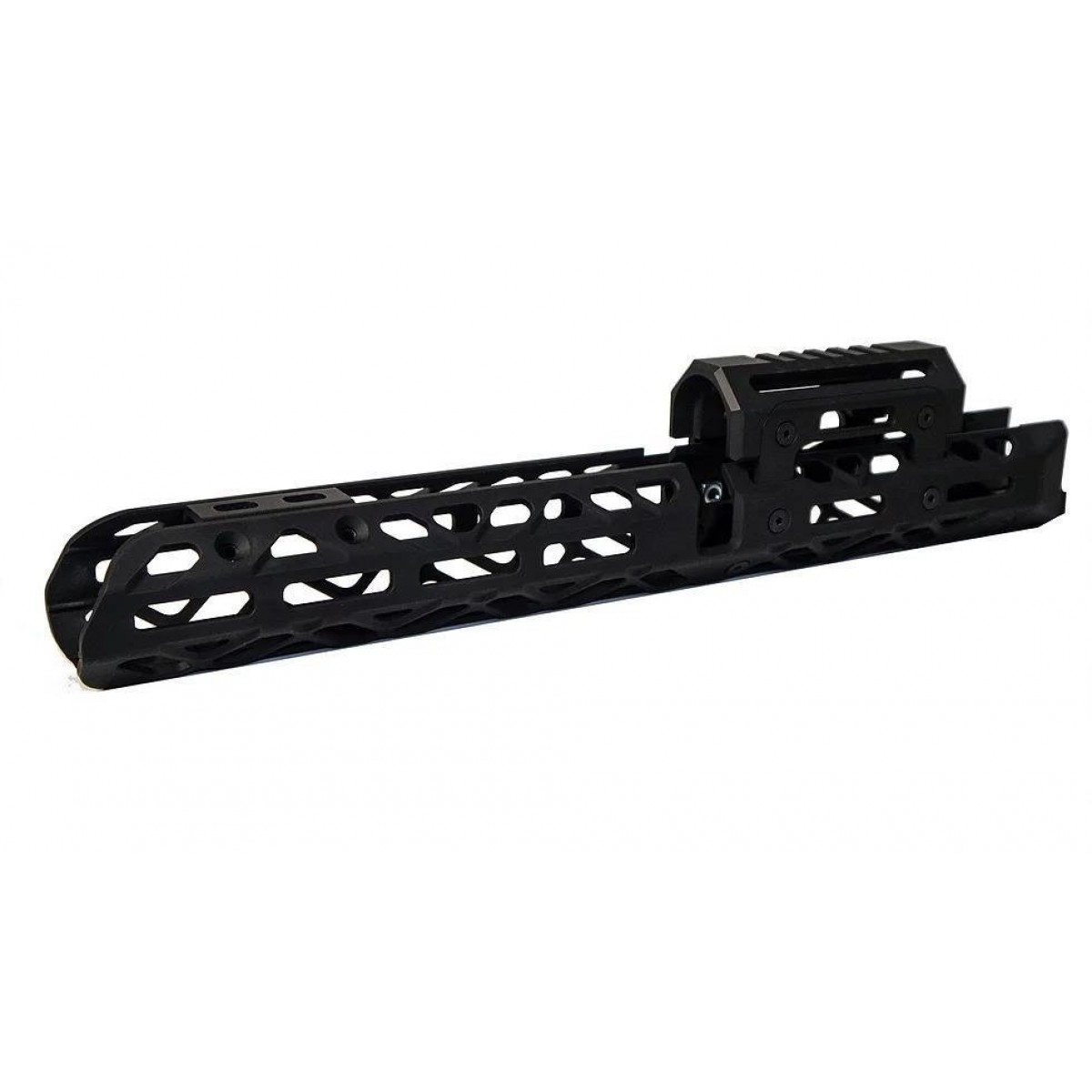 | Особливості: | 1 - жорстка алюмінієва конструкція. 2 - довжина 360 мм. 3 - Повна вага 420 грам. 4 - Кріплення M-Lok для аксесуарів 5 - встановлення на штатні посадкові місця, тому нічого пиляти не доведеться. 6 - Можливо використовувати як з рідною газовою трубкою, так і з трубками інших виробників. 7 - У комплект входять і верхня, і нижня частини цівки. |