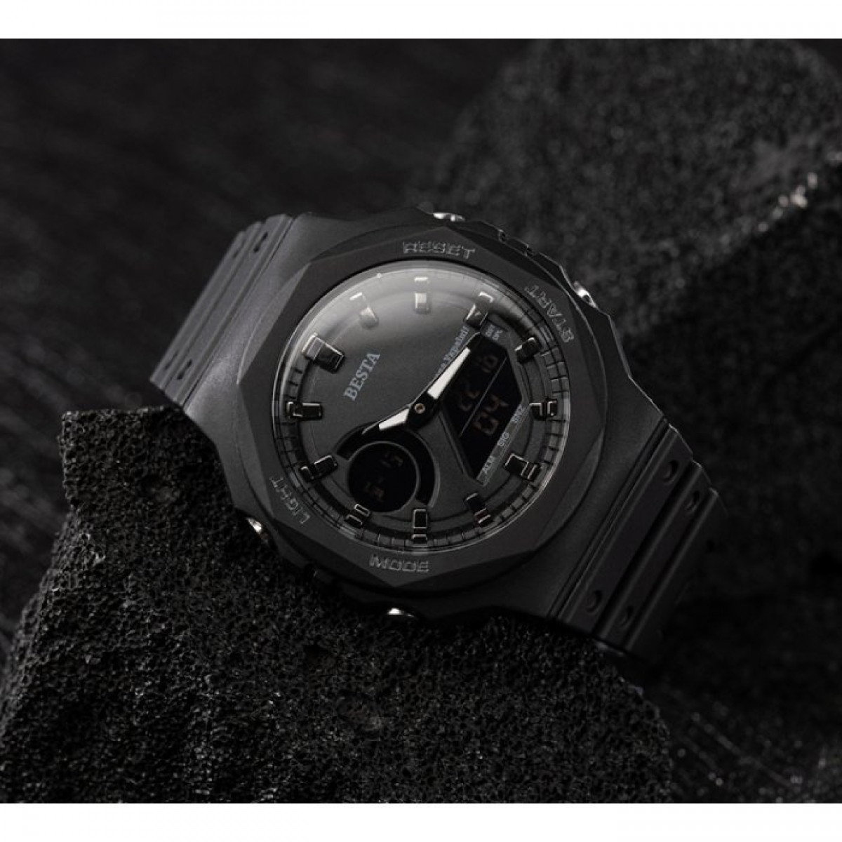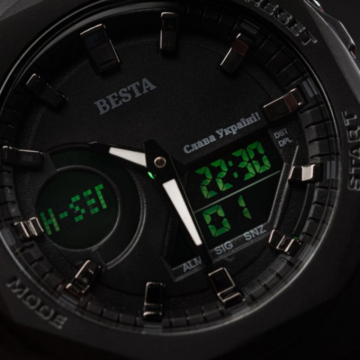 - Функції: секундомір, будильник, підсвітка, індикація часу стрілками та на дисплеї, дата, день тижня, місяць