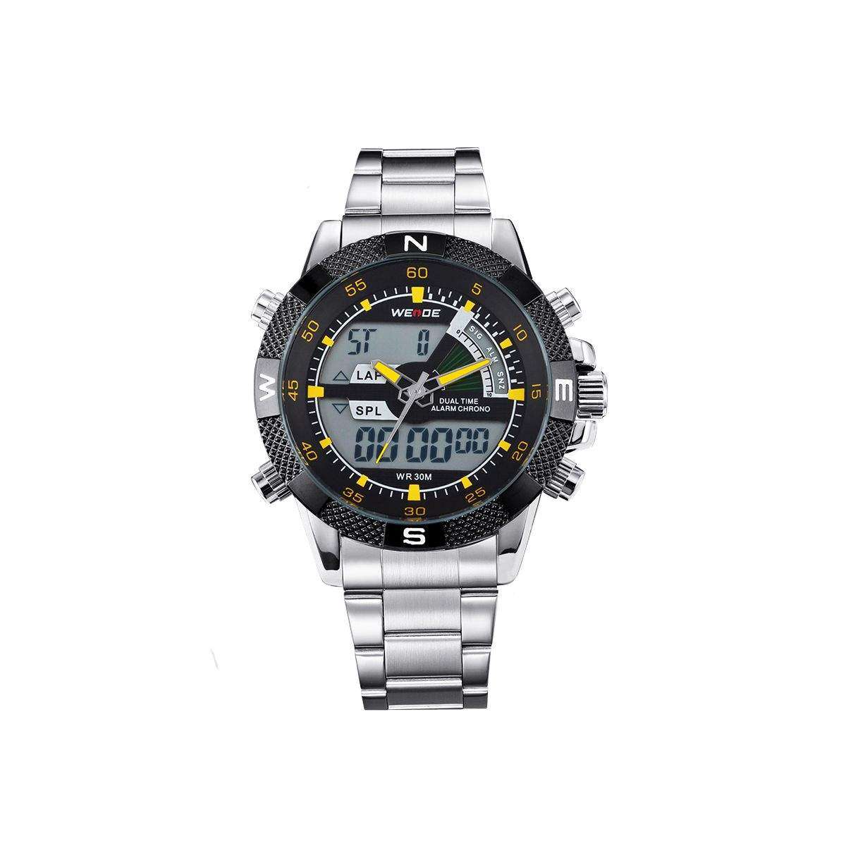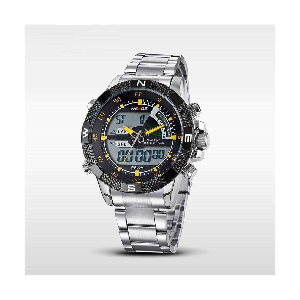 Наручний годинник WEIDE - стильний аксесуар, безумовно є невід'ємним атрибутом будь-якого сучасного чоловіка. Неймовірний брутальний дизайн, безліч функцій і незрівнянна практичність. Запорукою якості годинника є японський механізм Miyota в корпусі з нержавіючої сталі. Протиударні, водонепроникні моделі годин WEIDE володіють стійкістю до магнітного поля і є справжньою знахідкою для брутальних чоловіків, які віддають перевагу активний спосіб життя. Годинник WEIDE - збираються на трьох фабриках в Китаї і Японії з 2003року. З 2015 року Бренд займає лідируючі позиції з продажу в світі. Повна збірка і механізм виробляється в Японії. Кварцові годинники Weide здатні витримувати підвищені експлуатаційні навантаження, з легкістю витримають повсякденні будні і не залишать вас при заняттях спортом. Все завдяки бездоганній якості деталей і високому контролю якості в цілому. А головне, що такий необхідний аксесуар для чоловіка як годинник, від бренду WEIDE, доступний кожному.Відгуки про Годинник Weide Yellow WH1104-5C SS