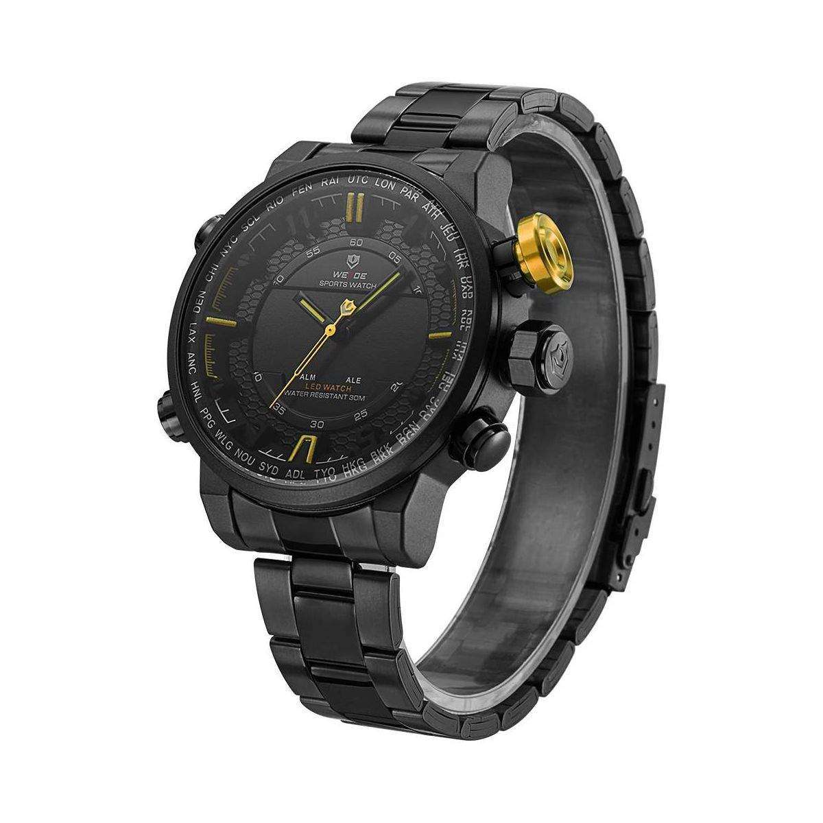 Наручний годинник WEIDE - стильний аксесуар, безумовно є невід'ємним атрибутом будь-якого сучасного чоловіка. Неймовірний брутальний дизайн, безліч функцій і незрівнянна практичність. Запорукою якості годинника є японський механізм Miyota в корпусі з нержавіючої сталі. Протиударні, водонепроникні моделі годин WEIDE володіють стійкістю до магнітного поля і є справжньою знахідкою для брутальних чоловіків, які віддають перевагу активний спосіб життя. Годинник WEIDE - збираються на трьох фабриках в Китаї і Японії з 2003року. З 2015 року Бренд займає лідируючі позиції з продажу в світі. Повна збірка і механізм виробляється в Японії. Кварцові годинники Weide здатні витримувати підвищені експлуатаційні навантаження, з легкістю витримають повсякденні будні і не залишать вас при заняттях спортом. Все завдяки бездоганній якості деталей і високому контролю якості в цілому. А головне, що такий необхідний аксесуар для чоловіка як годинник, від бренду WEIDE, доступний кожному.Відгуки про Годинник Weide Yellow WH6402B-3C SS