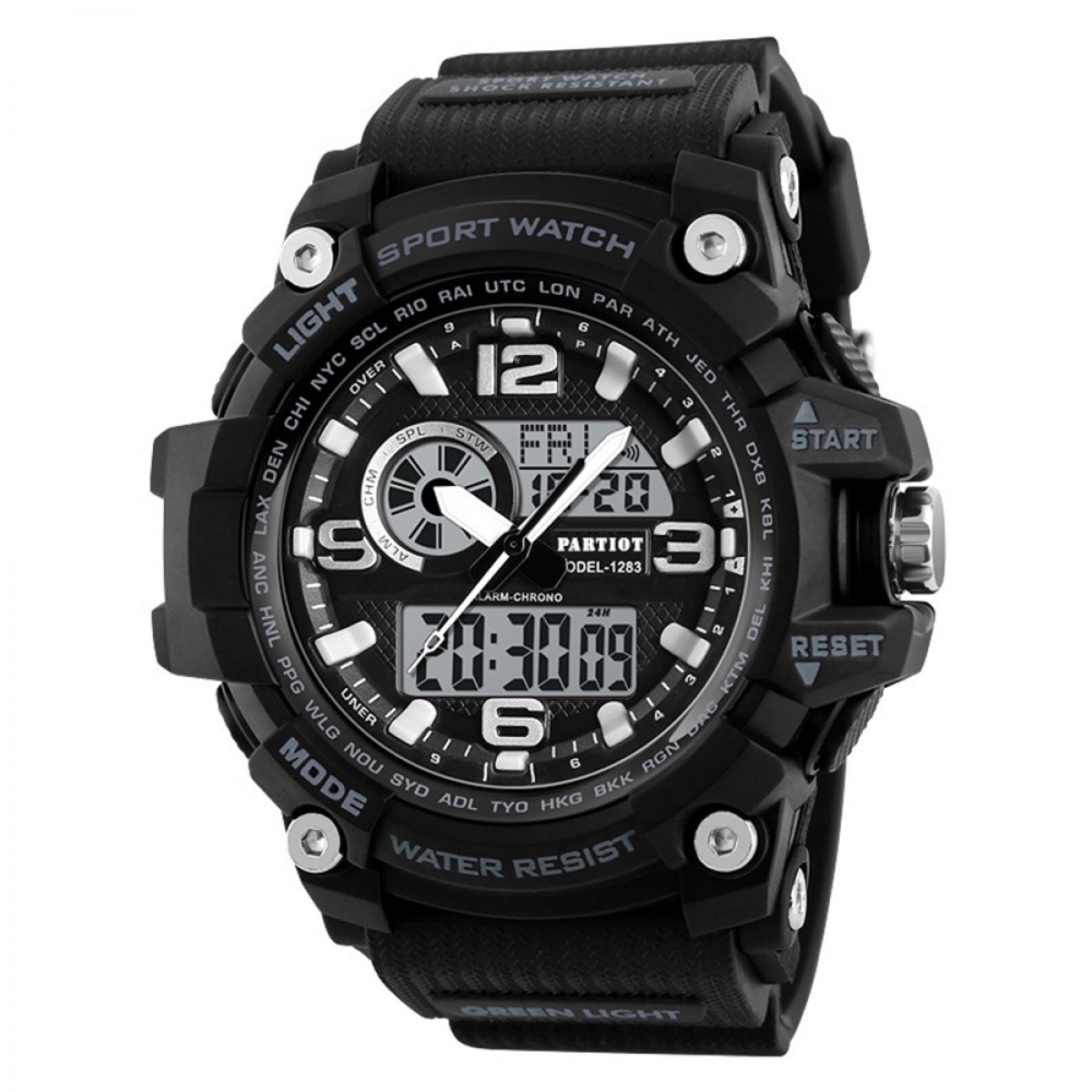Функціональність годинника вражає: він оснащений кварцевим механізмом, електролюмінесцентною підсвіткою та стрілочно-електронним циферблатом, на якому відображаються години, хвилини, секунди, день тижня, місяць і число. До того ж, ви зможете використовувати будильник, календар, другий часовий пояс та секундомір — всі необхідні функції для активного способу життя.