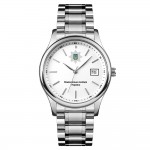 Мінеральне скло захищає стрілки, які показують час, хвилини, секунди, день тижня та число. Годинник оснащений електролюмінесцентною підсвіткою для зручності у темряві та працює на кварцевому механізмі.