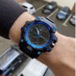Циферблат комбінований (стрілочно-електронний) з індикацією годин, секунд, дня тижня, місяця та числа. Додаткова функціональність включає будильник, секундомір і другий часовий пояс. Підсвічування електролюмінесцентне, що гарантує читабельність в умовах низької видимості. Годинник комплектується класичною застібкою та має стильний чорний та синій дизайн.