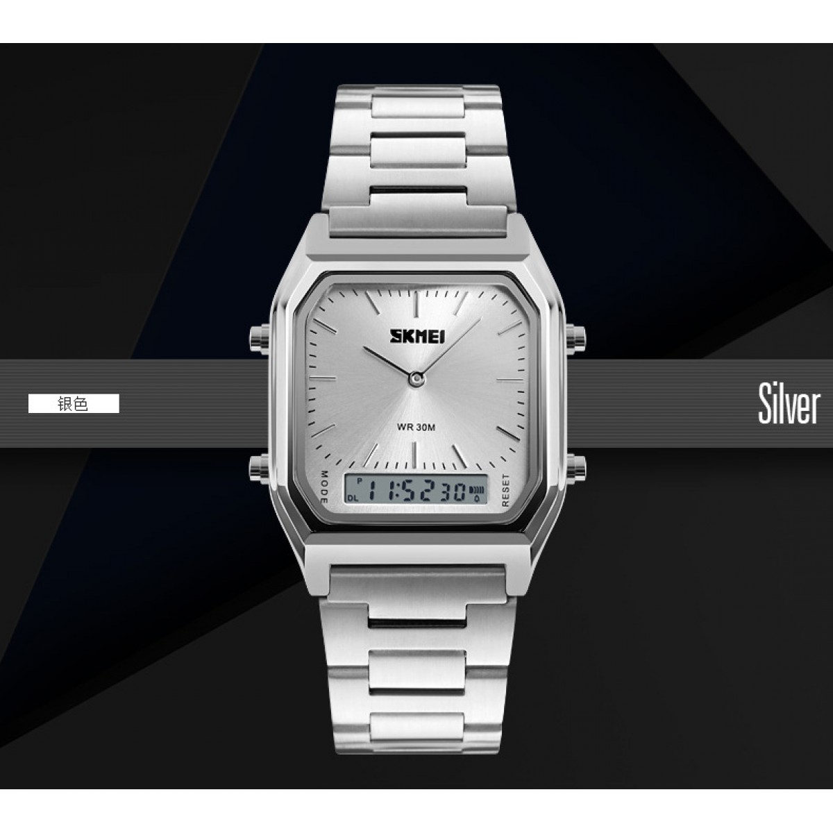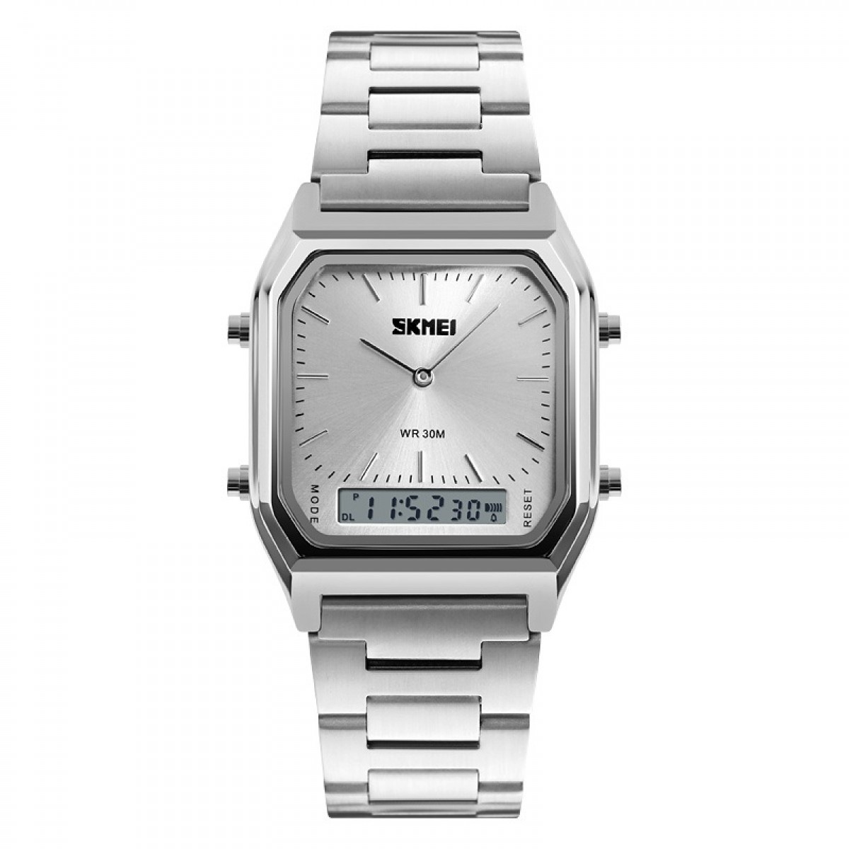 Годинник оснащений кварцовим механізмом, мінеральним склом та електролюмінесцентним підсвічуванням. Серед функцій – будильник, календар та секундомір. Водонепроникний до 30 метрів, Skmei 1220SI підходить для активного використання. Через 12 місяців ви отримуєте гарантію, що підтверджує надійність продукції. Час індикується через стрілки та електронний дисплей, а також резервує місце для інформації про день тижня та число. Ремінець легко підлаштовується під зап'ястя завдяки його довжині в 22 см та ширині 22 см. Вага годинника – 102 г. Виготовлено в Китаї.